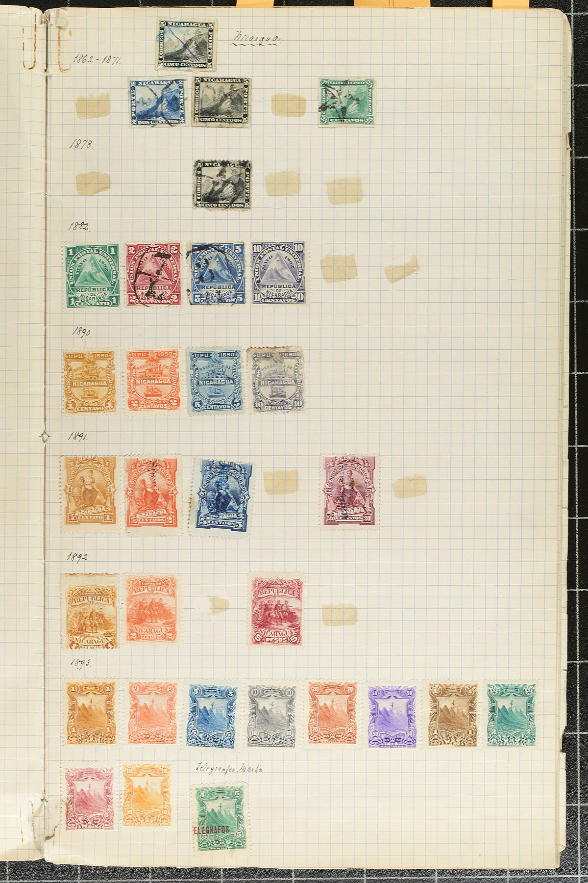 Old time album remainders of mint and used Central and South America, 1850's-1914, containing roughly 400 stamps on homemade pages. The collection contains better representation from Mexico and El Salvador, along with material from Nicaragua, Paraguay, Peru, Uruguay, and Venezuela. A spot check indicated a few stamps cataloguing $10 and up, noting selections of back of the book issues, and a few revenues. A few faults to be expected, but a nice start to this region containing classic issues. Estimate =