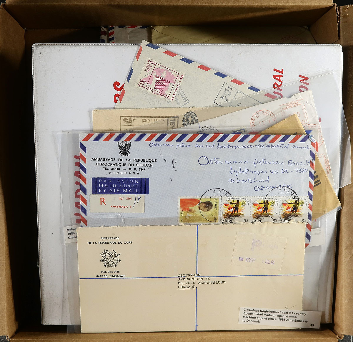 Interesting group of worldwide registered covers, 1940's-1990's, containing a few hundred covers in a binder and with loose material. The binder contains roughly 125 pages with a mixture of covers in corner mounts, and parcel fronts (many have been glued or taped to the page), along with over 100 loose covers. We note representation from India, Hong Kong, South America, Europe, and much more, noting a wide variety of registered etiquettes and boxed handstamps, with a few items priced from $5 to $10 each. A nice start to a very interesting postal history collection, a few faults to be expected, overall fine to very fine. Estimate =
