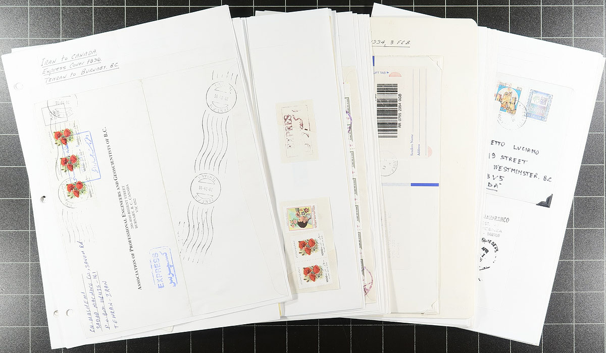 Interesting group of worldwide registered covers, 1940's-1990's, containing a few hundred covers in a binder and with loose material. The binder contains roughly 125 pages with a mixture of covers in corner mounts, and parcel fronts (many have been glued or taped to the page), along with over 100 loose covers. We note representation from India, Hong Kong, South America, Europe, and much more, noting a wide variety of registered etiquettes and boxed handstamps, with a few items priced from $5 to $10 each. A nice start to a very interesting postal history collection, a few faults to be expected, overall fine to very fine. Estimate =