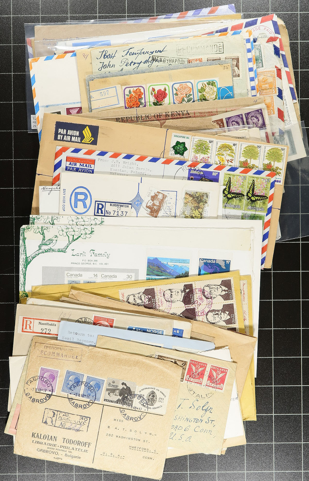 Interesting group of worldwide registered covers, 1940's-1990's, containing a few hundred covers in a binder and with loose material. The binder contains roughly 125 pages with a mixture of covers in corner mounts, and parcel fronts (many have been glued or taped to the page), along with over 100 loose covers. We note representation from India, Hong Kong, South America, Europe, and much more, noting a wide variety of registered etiquettes and boxed handstamps, with a few items priced from $5 to $10 each. A nice start to a very interesting postal history collection, a few faults to be expected, overall fine to very fine. Estimate =