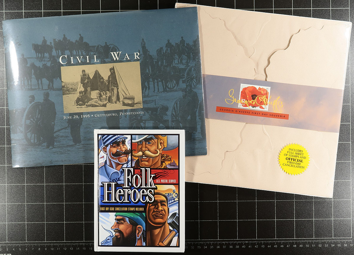 Interesting group of oversized United States first day covers, roughly 50 in total generally ranging from the 1970's-1990's, noting singles and several sheetlet frankings. Also included are post office folders and programs, along with a few items still in the original sealed packaging. A nice group for collectors, as some of these items retailed $10 and up each. Estimate =
