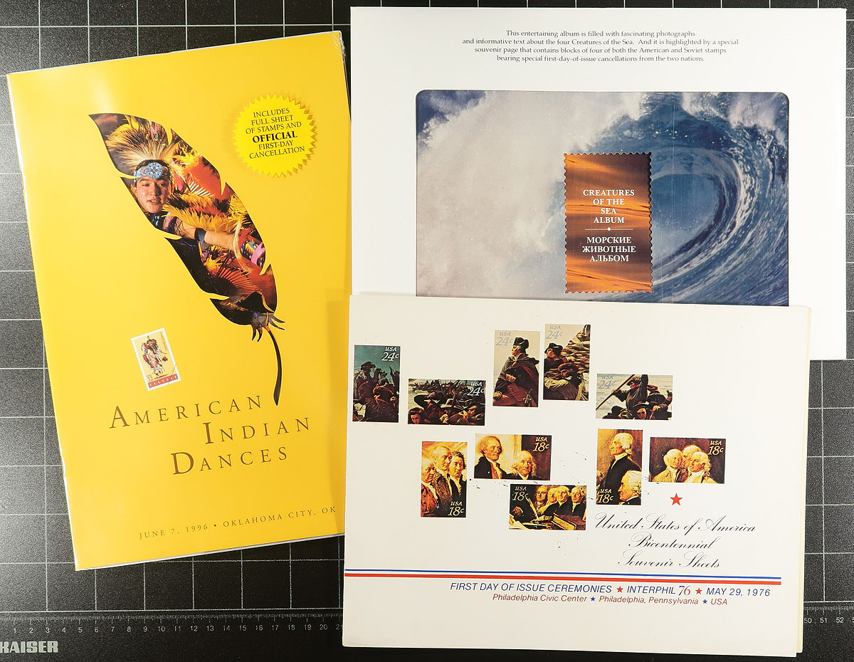 Interesting group of oversized United States first day covers, roughly 50 in total generally ranging from the 1970's-1990's, noting singles and several sheetlet frankings. Also included are post office folders and programs, along with a few items still in the original sealed packaging. A nice group for collectors, as some of these items retailed $10 and up each. Estimate =