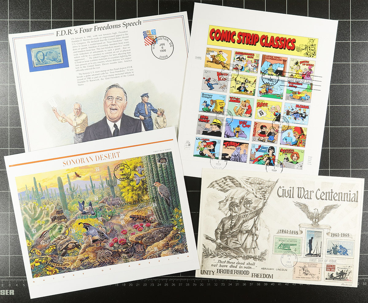 Interesting group of oversized United States first day covers, roughly 50 in total generally ranging from the 1970's-1990's, noting singles and several sheetlet frankings. Also included are post office folders and programs, along with a few items still in the original sealed packaging. A nice group for collectors, as some of these items retailed $10 and up each. Estimate =