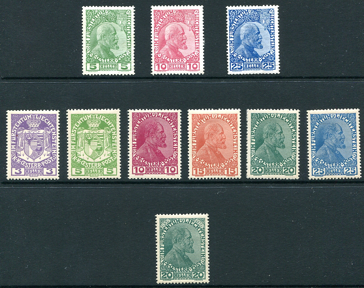 Complete mint Hinged run of the 1912-1918 Prince Johann II / Coat of Arms sets, including the 1912 set of 3, 1917-1918 set of 6 and 1918 "Dates in Upper Corners" single. A lovely assembly. 2025 Scott US$225.20 =