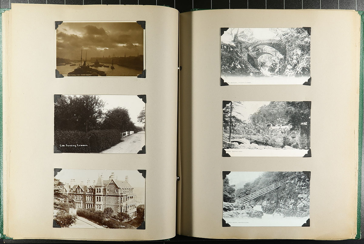 Family Postcard Collection Part D. The fourth and final installment of this family holding, this time housed in an overside "Scrap Book" with postcards held in-place with photo corners. A total of 156 postcards which take an international journey, starting in the UK then venturing to Canada, Netherlands, France, Germany, China, Norway, USA and Malta (and likely a few others we didn't note). Many better postcards noted, a few have been cut down a bit (to make for uniform sizing), mentioned "for the record". Offered as received, as one of four lots, all in this sale from the same family. Estimate =
