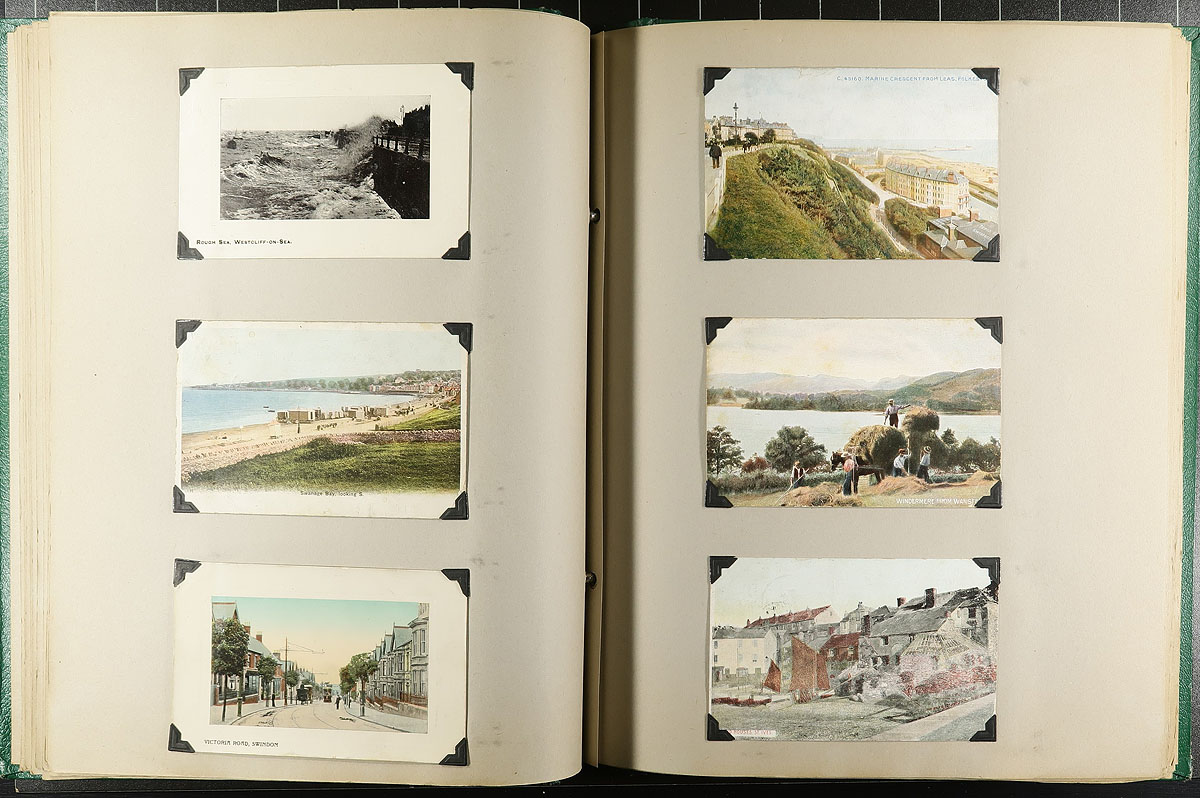 Family Postcard Collection Part D. The fourth and final installment of this family holding, this time housed in an overside "Scrap Book" with postcards held in-place with photo corners. A total of 156 postcards which take an international journey, starting in the UK then venturing to Canada, Netherlands, France, Germany, China, Norway, USA and Malta (and likely a few others we didn't note). Many better postcards noted, a few have been cut down a bit (to make for uniform sizing), mentioned "for the record". Offered as received, as one of four lots, all in this sale from the same family. Estimate =