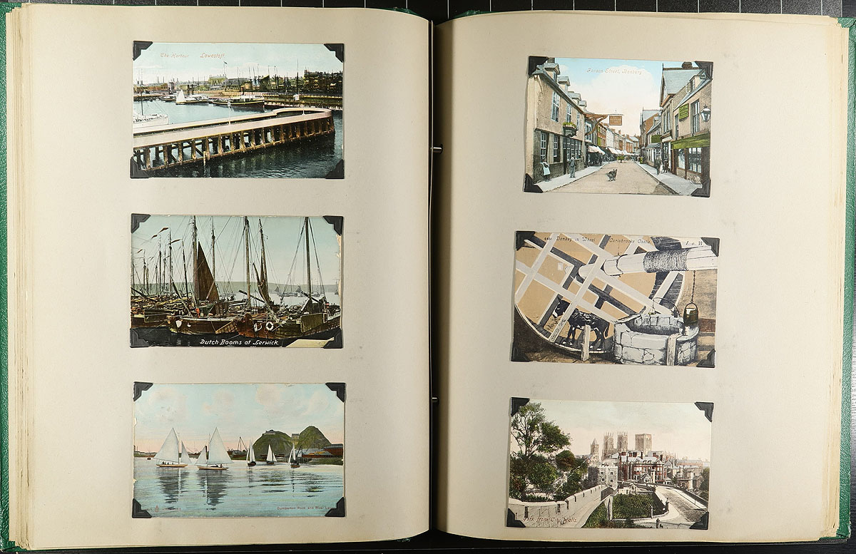 Family Postcard Collection Part D. The fourth and final installment of this family holding, this time housed in an overside "Scrap Book" with postcards held in-place with photo corners. A total of 156 postcards which take an international journey, starting in the UK then venturing to Canada, Netherlands, France, Germany, China, Norway, USA and Malta (and likely a few others we didn't note). Many better postcards noted, a few have been cut down a bit (to make for uniform sizing), mentioned "for the record". Offered as received, as one of four lots, all in this sale from the same family. Estimate =