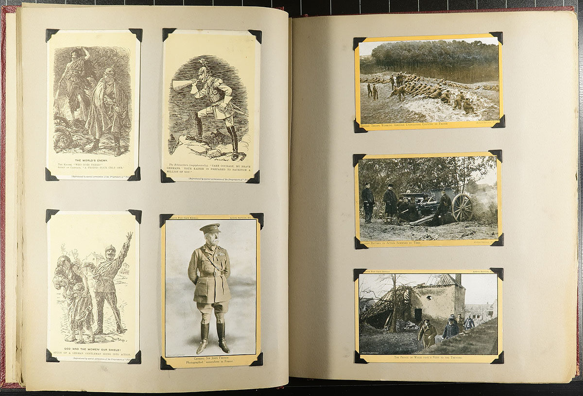 Family Postcard Collection Part C. The third installment of this family holding, this time housed in an overside "Scrap Book" with postcards held in-place with photo corners. A total of 190 postcards, which follow a very interesting "topical" theme. In order of appearance, this album features "Royals", Military Figures, Funeral of Edward VII, Soldiers / WWI Scenes, Ships and Early Airplanes. Offered as received, as one of four lots, all in this sale from the same family. This one being the "crown jewel" of the holding. Estimate =