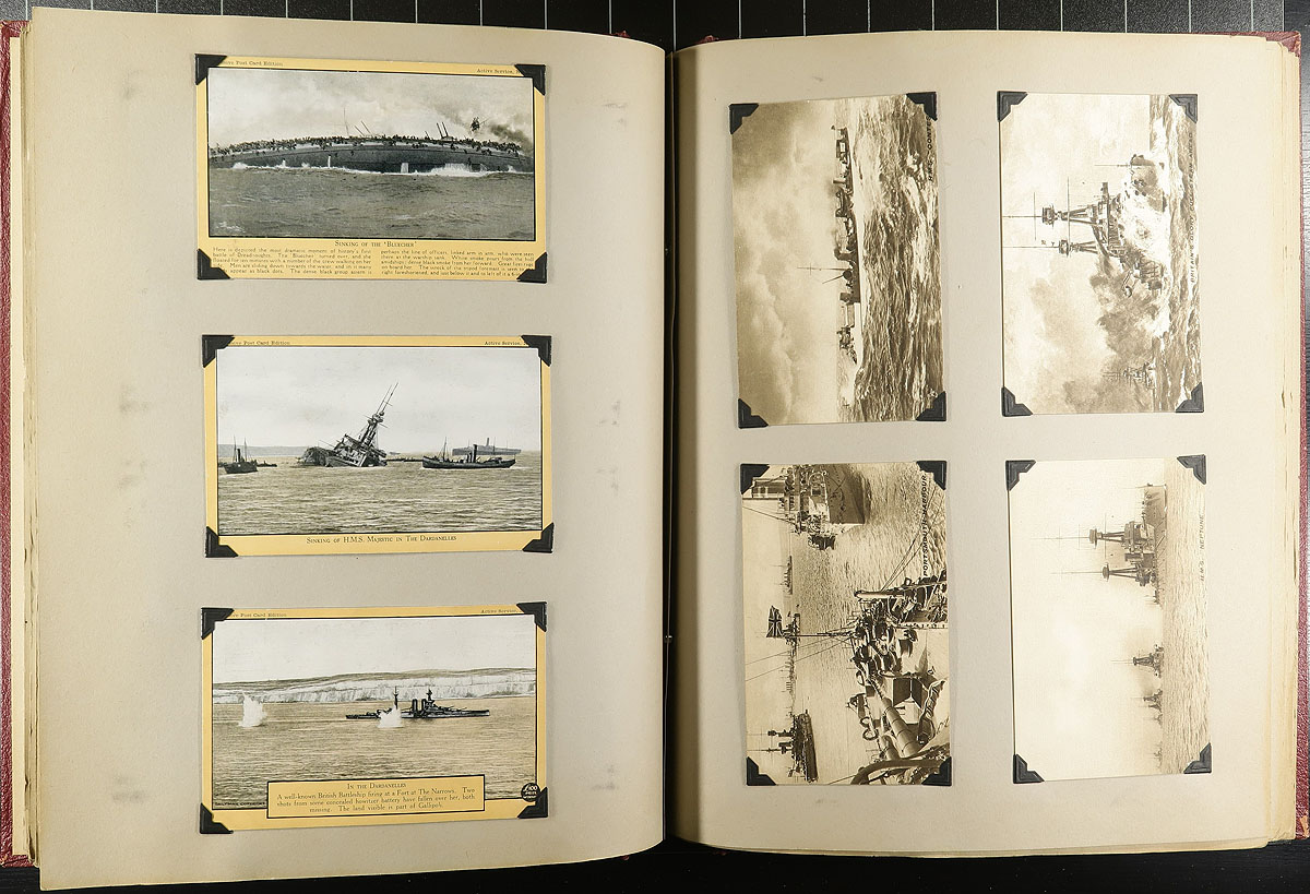 Family Postcard Collection Part C. The third installment of this family holding, this time housed in an overside "Scrap Book" with postcards held in-place with photo corners. A total of 190 postcards, which follow a very interesting "topical" theme. In order of appearance, this album features "Royals", Military Figures, Funeral of Edward VII, Soldiers / WWI Scenes, Ships and Early Airplanes. Offered as received, as one of four lots, all in this sale from the same family. This one being the "crown jewel" of the holding. Estimate =