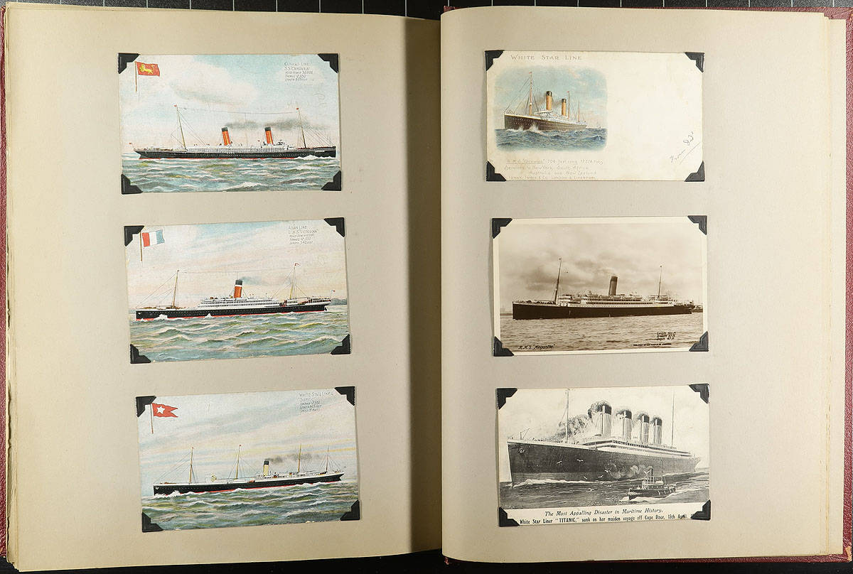 Family Postcard Collection Part C. The third installment of this family holding, this time housed in an overside "Scrap Book" with postcards held in-place with photo corners. A total of 190 postcards, which follow a very interesting "topical" theme. In order of appearance, this album features "Royals", Military Figures, Funeral of Edward VII, Soldiers / WWI Scenes, Ships and Early Airplanes. Offered as received, as one of four lots, all in this sale from the same family. This one being the "crown jewel" of the holding. Estimate =