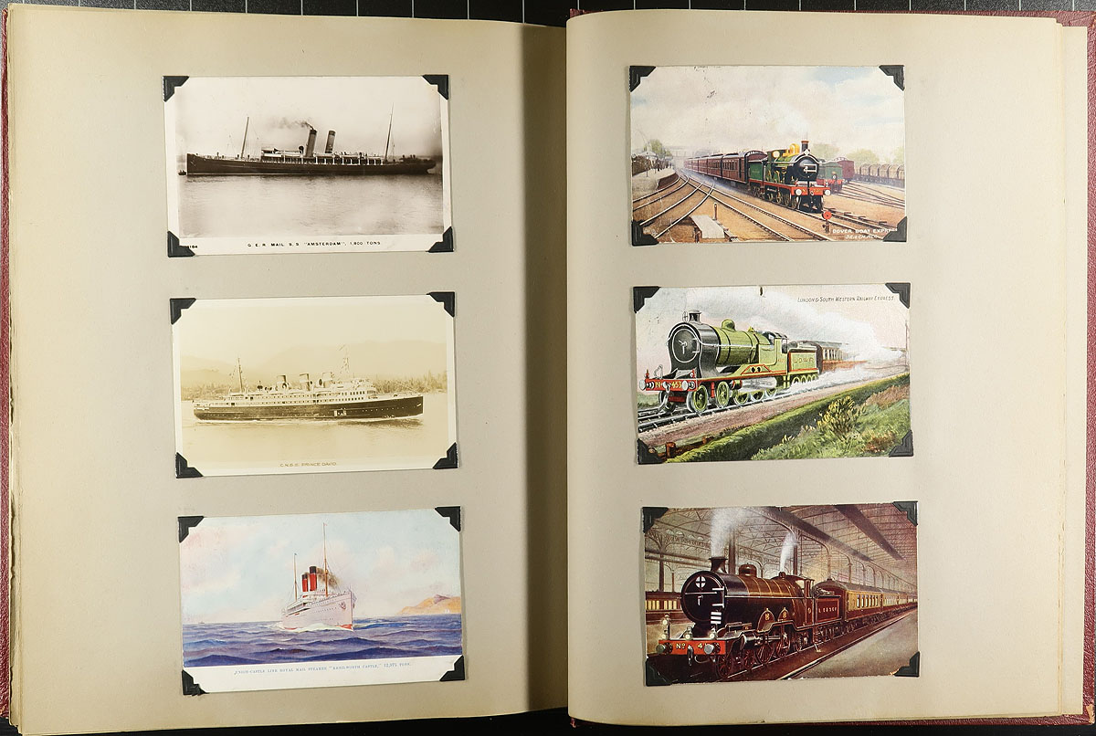 Family Postcard Collection Part C. The third installment of this family holding, this time housed in an overside "Scrap Book" with postcards held in-place with photo corners. A total of 190 postcards, which follow a very interesting "topical" theme. In order of appearance, this album features "Royals", Military Figures, Funeral of Edward VII, Soldiers / WWI Scenes, Ships and Early Airplanes. Offered as received, as one of four lots, all in this sale from the same family. This one being the "crown jewel" of the holding. Estimate =