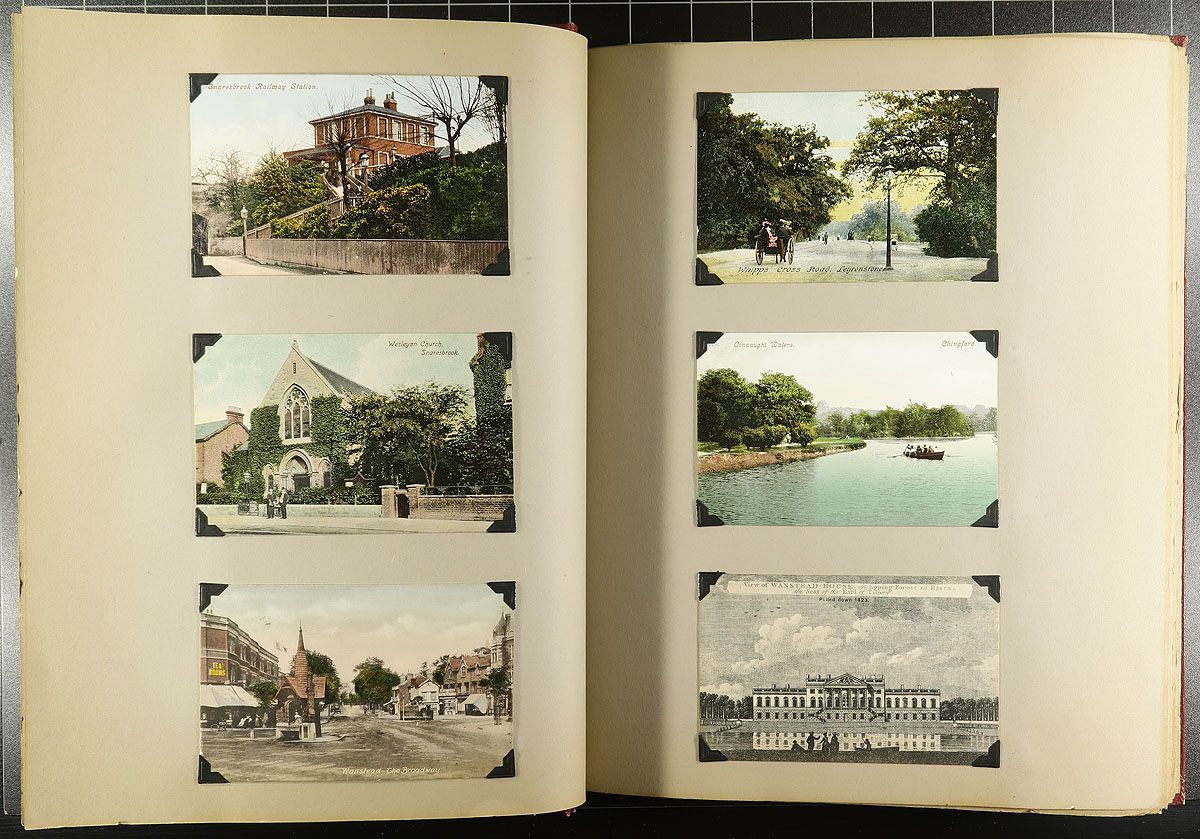 Family Postcard Collection Part B. The second installment of this family holding, this time housed in an overside "Scrap Book" with postcards held in-place with photo corners. A total of 194 postcards, this one clearly themed in "British" views, starting in London and then travelling around Britain. Of particular note are the MANY high-quality RPPC (real photo postcards) and street / village scenes. Offered as received, as one of four lots, all in this sale from the same family. Estimate =