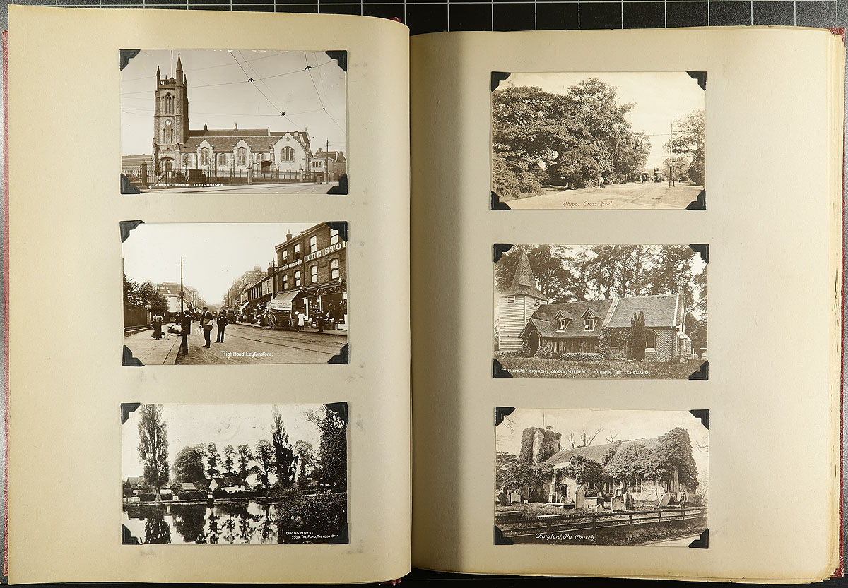 Family Postcard Collection Part B. The second installment of this family holding, this time housed in an overside "Scrap Book" with postcards held in-place with photo corners. A total of 194 postcards, this one clearly themed in "British" views, starting in London and then travelling around Britain. Of particular note are the MANY high-quality RPPC (real photo postcards) and street / village scenes. Offered as received, as one of four lots, all in this sale from the same family. Estimate =