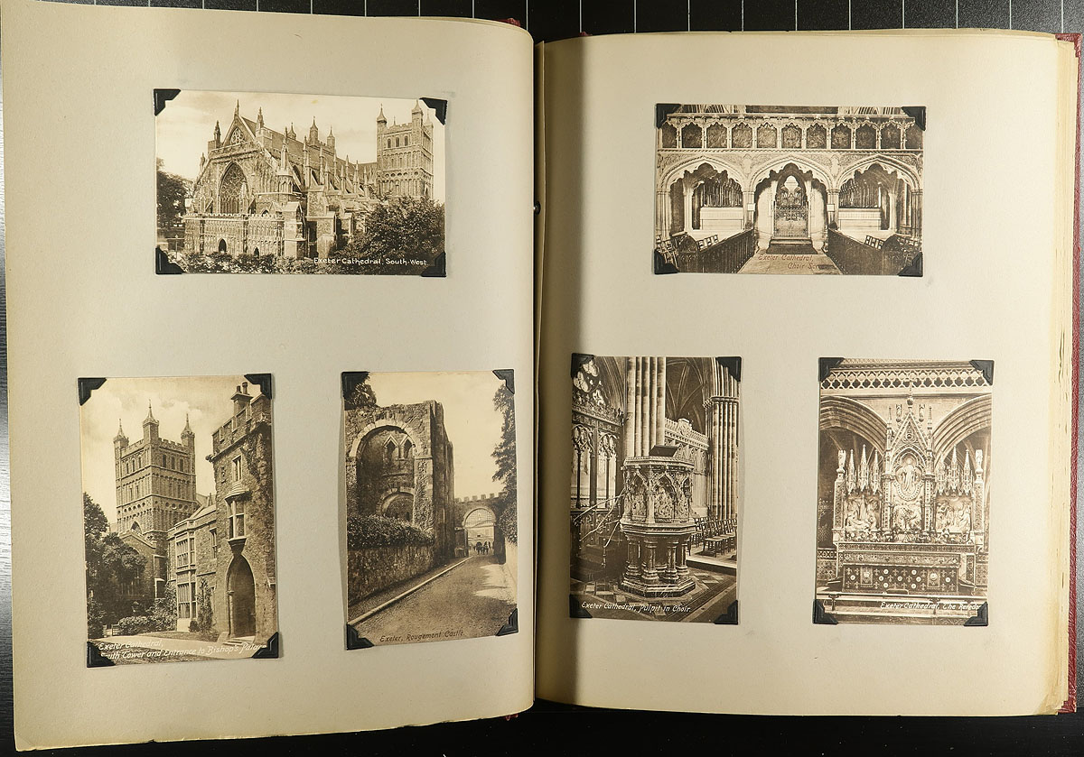 Family Postcard Collection Part B. The second installment of this family holding, this time housed in an overside "Scrap Book" with postcards held in-place with photo corners. A total of 194 postcards, this one clearly themed in "British" views, starting in London and then travelling around Britain. Of particular note are the MANY high-quality RPPC (real photo postcards) and street / village scenes. Offered as received, as one of four lots, all in this sale from the same family. Estimate =