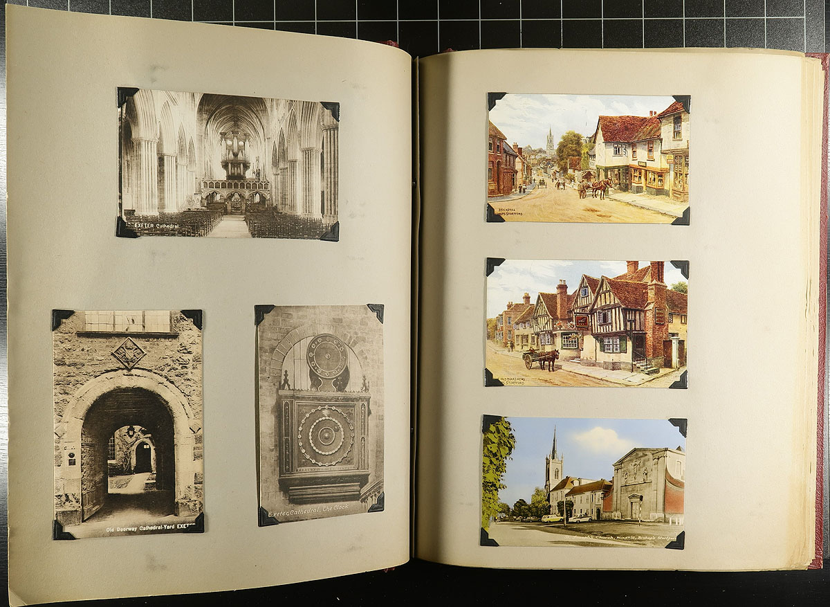 Family Postcard Collection Part B. The second installment of this family holding, this time housed in an overside "Scrap Book" with postcards held in-place with photo corners. A total of 194 postcards, this one clearly themed in "British" views, starting in London and then travelling around Britain. Of particular note are the MANY high-quality RPPC (real photo postcards) and street / village scenes. Offered as received, as one of four lots, all in this sale from the same family. Estimate =