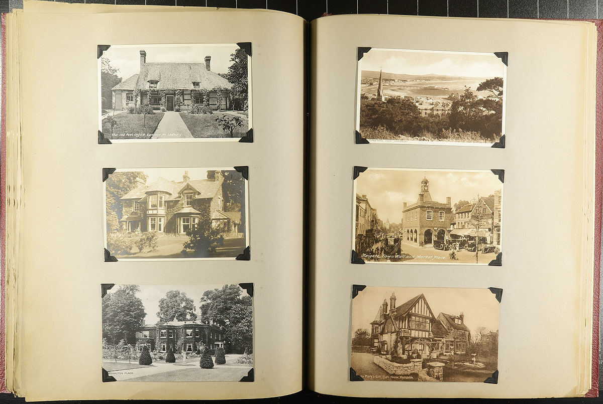 Family Postcard Collection Part B. The second installment of this family holding, this time housed in an overside "Scrap Book" with postcards held in-place with photo corners. A total of 194 postcards, this one clearly themed in "British" views, starting in London and then travelling around Britain. Of particular note are the MANY high-quality RPPC (real photo postcards) and street / village scenes. Offered as received, as one of four lots, all in this sale from the same family. Estimate =