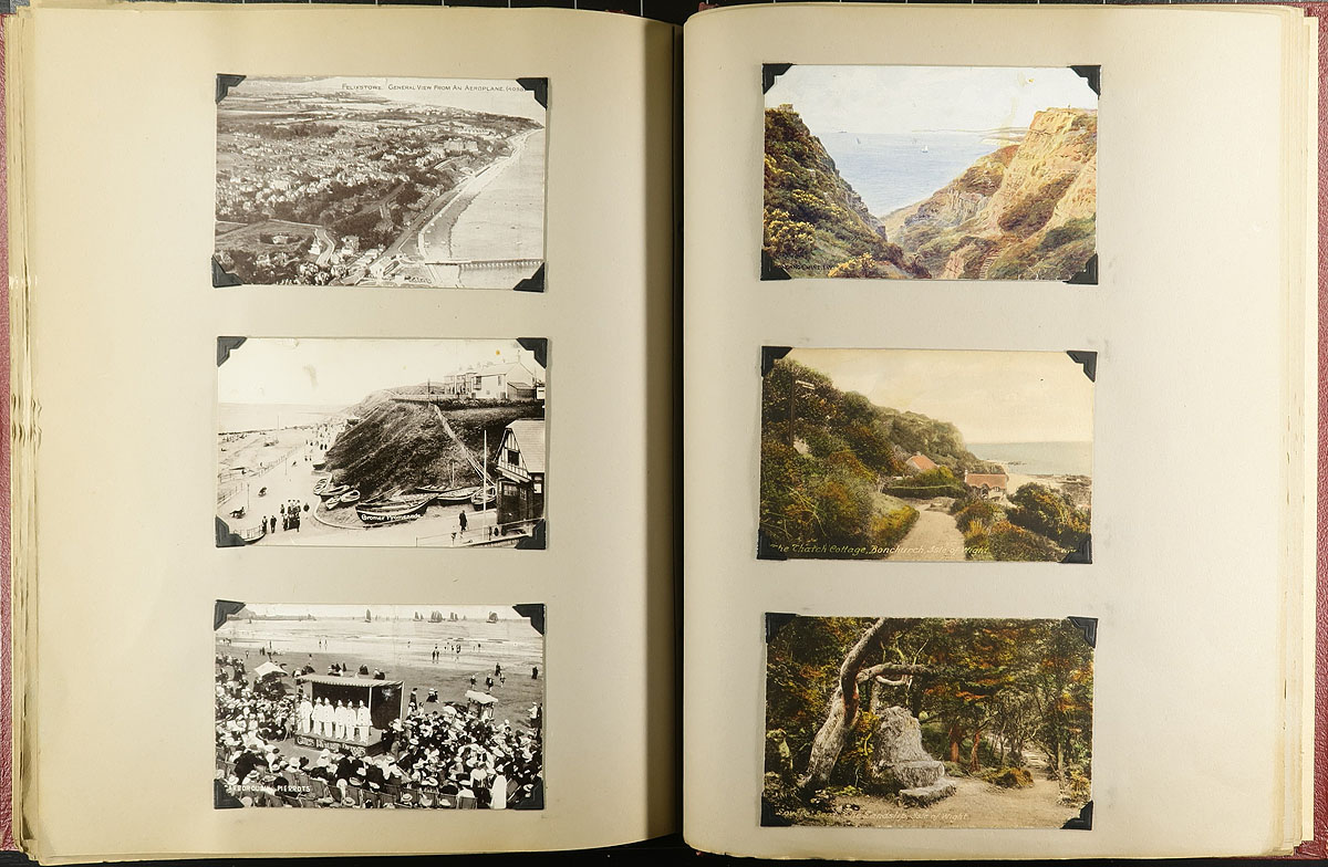 Family Postcard Collection Part B. The second installment of this family holding, this time housed in an overside "Scrap Book" with postcards held in-place with photo corners. A total of 194 postcards, this one clearly themed in "British" views, starting in London and then travelling around Britain. Of particular note are the MANY high-quality RPPC (real photo postcards) and street / village scenes. Offered as received, as one of four lots, all in this sale from the same family. Estimate =