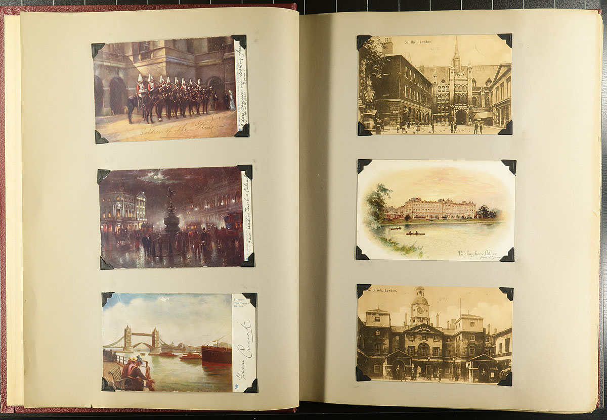 Family Postcard Collection Part B. The second installment of this family holding, this time housed in an overside "Scrap Book" with postcards held in-place with photo corners. A total of 194 postcards, this one clearly themed in "British" views, starting in London and then travelling around Britain. Of particular note are the MANY high-quality RPPC (real photo postcards) and street / village scenes. Offered as received, as one of four lots, all in this sale from the same family. Estimate =