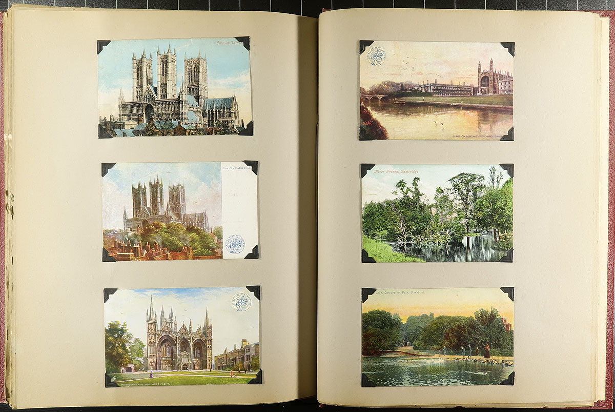 Family Postcard Collection Part B. The second installment of this family holding, this time housed in an overside "Scrap Book" with postcards held in-place with photo corners. A total of 194 postcards, this one clearly themed in "British" views, starting in London and then travelling around Britain. Of particular note are the MANY high-quality RPPC (real photo postcards) and street / village scenes. Offered as received, as one of four lots, all in this sale from the same family. Estimate =