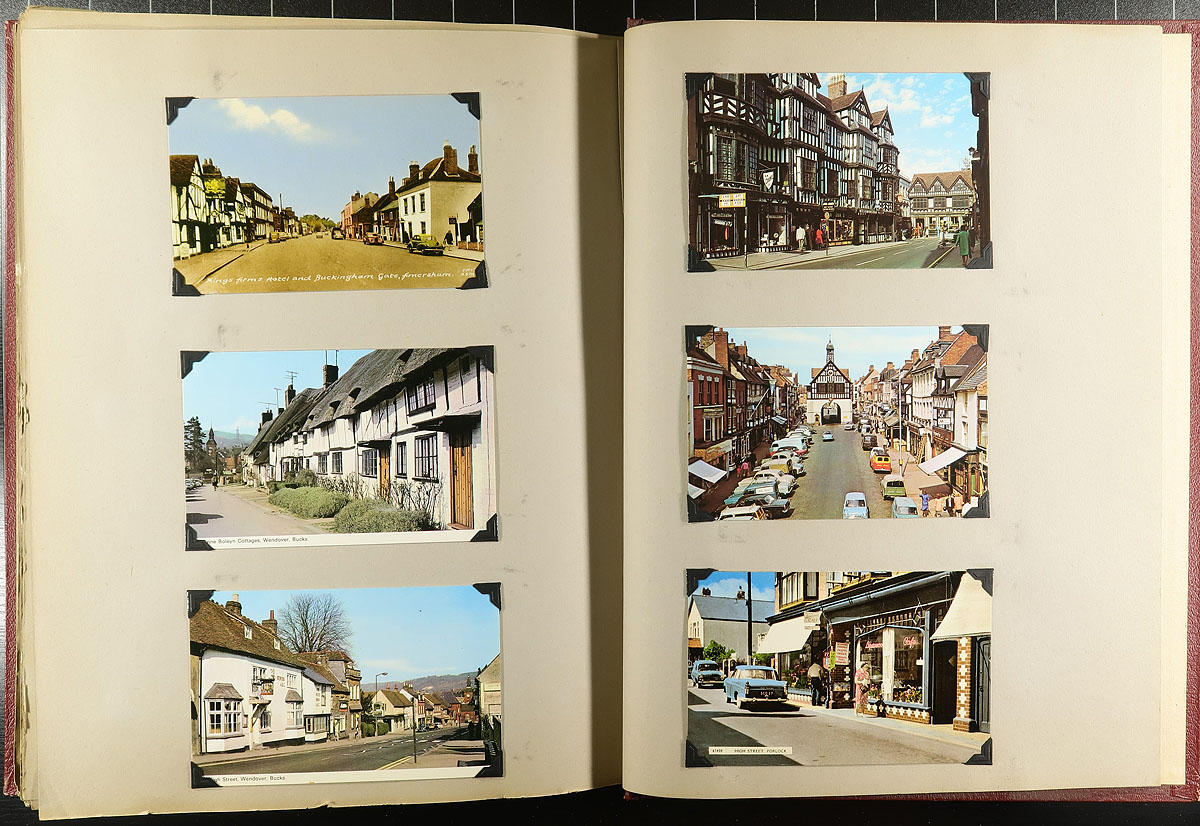 Family Postcard Collection Part B. The second installment of this family holding, this time housed in an overside "Scrap Book" with postcards held in-place with photo corners. A total of 194 postcards, this one clearly themed in "British" views, starting in London and then travelling around Britain. Of particular note are the MANY high-quality RPPC (real photo postcards) and street / village scenes. Offered as received, as one of four lots, all in this sale from the same family. Estimate =