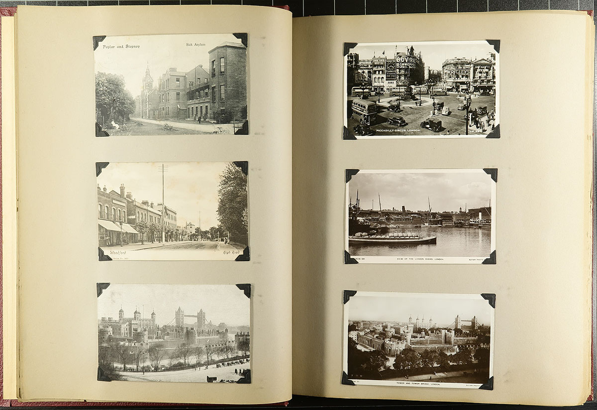 Family Postcard Collection Part B. The second installment of this family holding, this time housed in an overside "Scrap Book" with postcards held in-place with photo corners. A total of 194 postcards, this one clearly themed in "British" views, starting in London and then travelling around Britain. Of particular note are the MANY high-quality RPPC (real photo postcards) and street / village scenes. Offered as received, as one of four lots, all in this sale from the same family. Estimate =