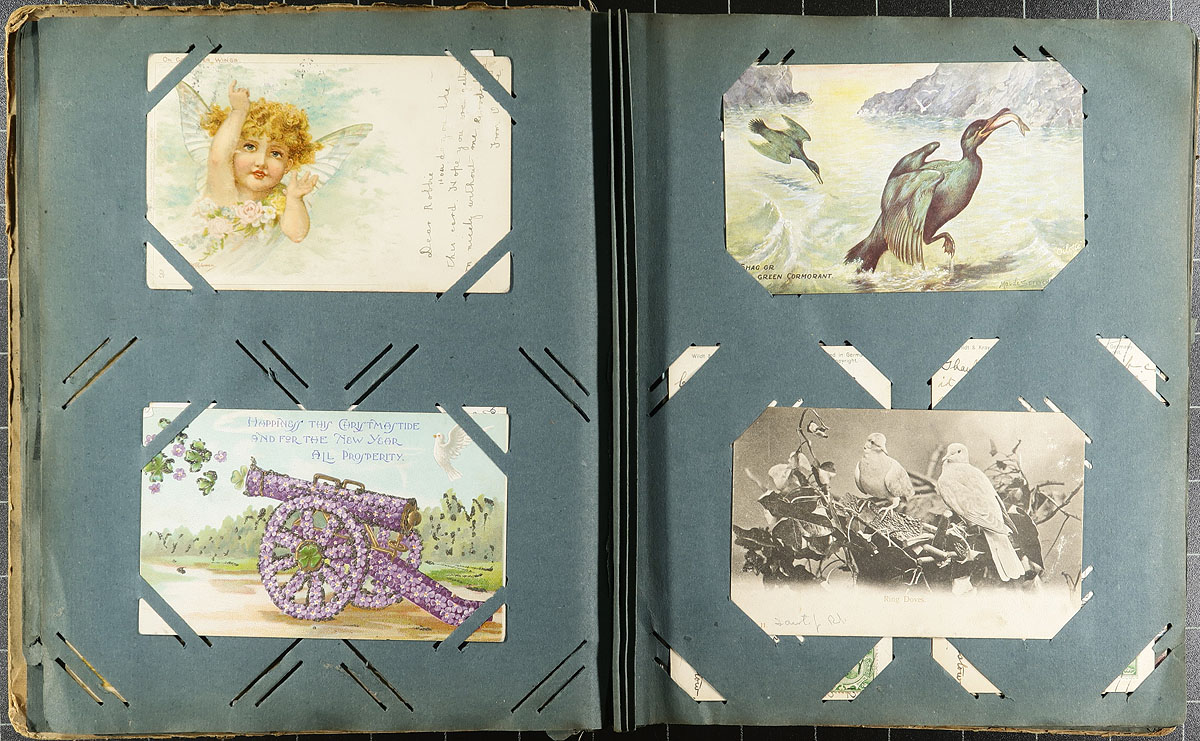 Family Postcard Collection Part A. An old-time collection of 187 postcards, in an equally old-time paper Postcard Album. While time has not been kind to the album, the postcards in have mostly held in-place, with several "loose" from when fallen out at sometime. While fairly "British" in origin, there are interesting cards mixed throughout including WWI Patriotic, "Captured German UC5 Mine Laying Submarine", Real Photo Postcards, 1915 Belgian Relief Fund, Dog/Cat illustrated (including Louis Wain), Greetings, Foreign etc. Offered as received, as one of four lots, all in this sale from the same family. Estimate =