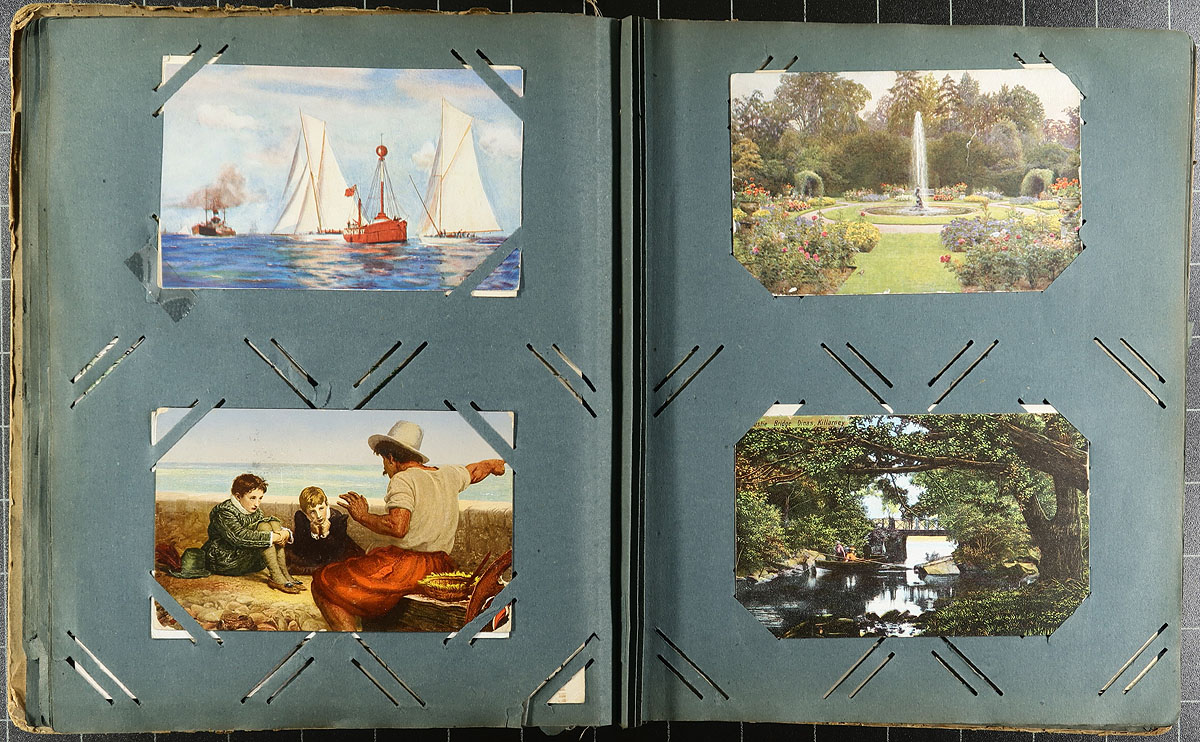Family Postcard Collection Part A. An old-time collection of 187 postcards, in an equally old-time paper Postcard Album. While time has not been kind to the album, the postcards in have mostly held in-place, with several "loose" from when fallen out at sometime. While fairly "British" in origin, there are interesting cards mixed throughout including WWI Patriotic, "Captured German UC5 Mine Laying Submarine", Real Photo Postcards, 1915 Belgian Relief Fund, Dog/Cat illustrated (including Louis Wain), Greetings, Foreign etc. Offered as received, as one of four lots, all in this sale from the same family. Estimate =