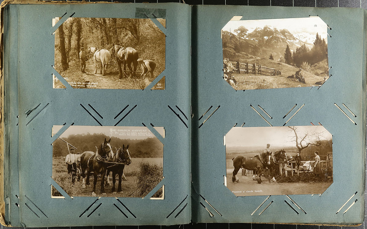 Family Postcard Collection Part A. An old-time collection of 187 postcards, in an equally old-time paper Postcard Album. While time has not been kind to the album, the postcards in have mostly held in-place, with several "loose" from when fallen out at sometime. While fairly "British" in origin, there are interesting cards mixed throughout including WWI Patriotic, "Captured German UC5 Mine Laying Submarine", Real Photo Postcards, 1915 Belgian Relief Fund, Dog/Cat illustrated (including Louis Wain), Greetings, Foreign etc. Offered as received, as one of four lots, all in this sale from the same family. Estimate =