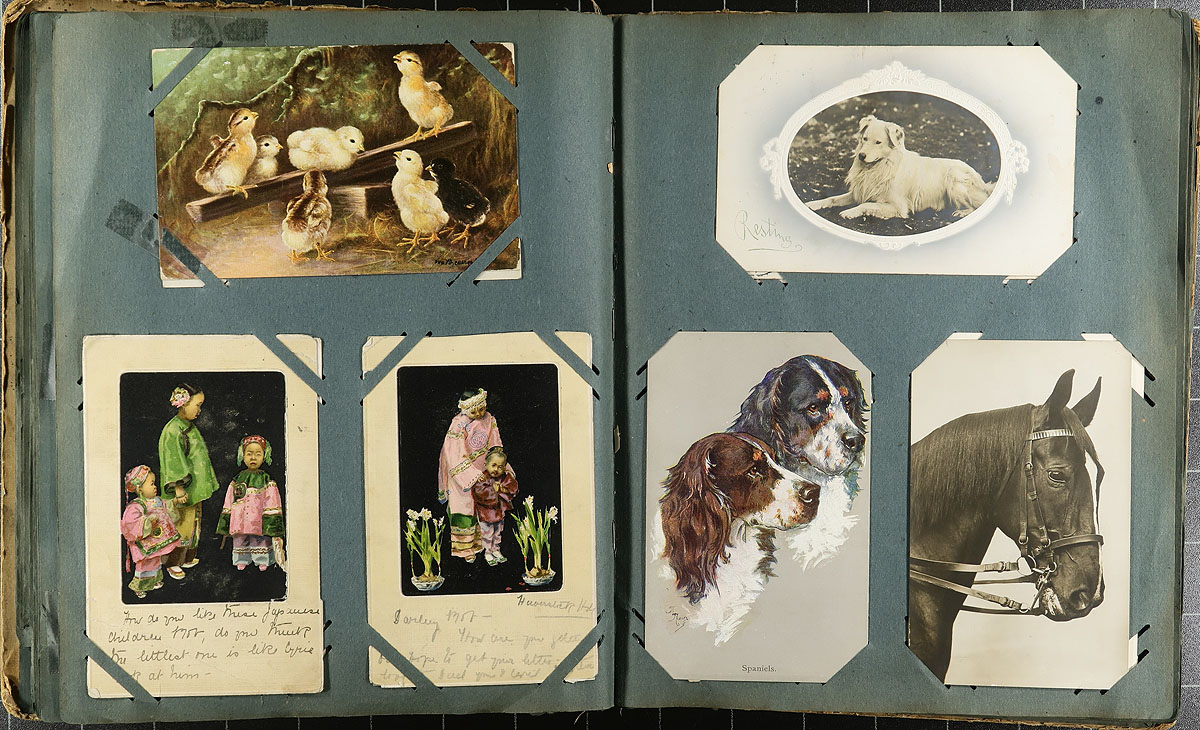 Family Postcard Collection Part A. An old-time collection of 187 postcards, in an equally old-time paper Postcard Album. While time has not been kind to the album, the postcards in have mostly held in-place, with several "loose" from when fallen out at sometime. While fairly "British" in origin, there are interesting cards mixed throughout including WWI Patriotic, "Captured German UC5 Mine Laying Submarine", Real Photo Postcards, 1915 Belgian Relief Fund, Dog/Cat illustrated (including Louis Wain), Greetings, Foreign etc. Offered as received, as one of four lots, all in this sale from the same family. Estimate =