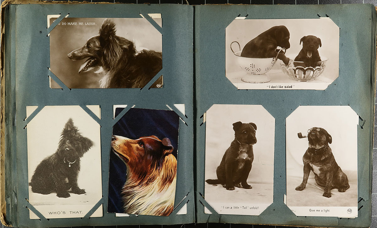 Family Postcard Collection Part A. An old-time collection of 187 postcards, in an equally old-time paper Postcard Album. While time has not been kind to the album, the postcards in have mostly held in-place, with several "loose" from when fallen out at sometime. While fairly "British" in origin, there are interesting cards mixed throughout including WWI Patriotic, "Captured German UC5 Mine Laying Submarine", Real Photo Postcards, 1915 Belgian Relief Fund, Dog/Cat illustrated (including Louis Wain), Greetings, Foreign etc. Offered as received, as one of four lots, all in this sale from the same family. Estimate =