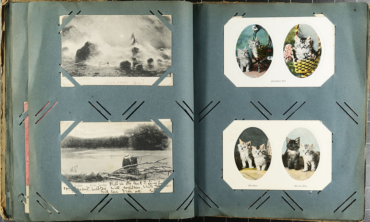 Family Postcard Collection Part A. An old-time collection of 187 postcards, in an equally old-time paper Postcard Album. While time has not been kind to the album, the postcards in have mostly held in-place, with several "loose" from when fallen out at sometime. While fairly "British" in origin, there are interesting cards mixed throughout including WWI Patriotic, "Captured German UC5 Mine Laying Submarine", Real Photo Postcards, 1915 Belgian Relief Fund, Dog/Cat illustrated (including Louis Wain), Greetings, Foreign etc. Offered as received, as one of four lots, all in this sale from the same family. Estimate =