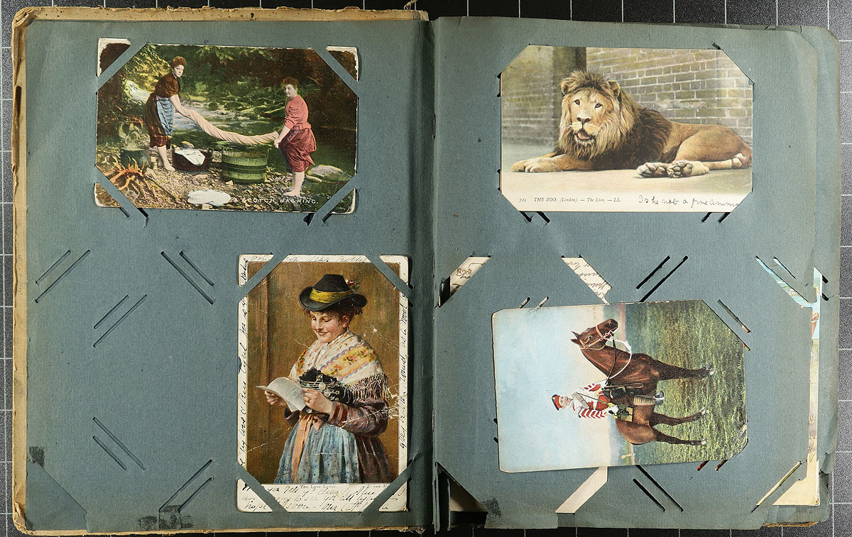 Family Postcard Collection Part A. An old-time collection of 187 postcards, in an equally old-time paper Postcard Album. While time has not been kind to the album, the postcards in have mostly held in-place, with several "loose" from when fallen out at sometime. While fairly "British" in origin, there are interesting cards mixed throughout including WWI Patriotic, "Captured German UC5 Mine Laying Submarine", Real Photo Postcards, 1915 Belgian Relief Fund, Dog/Cat illustrated (including Louis Wain), Greetings, Foreign etc. Offered as received, as one of four lots, all in this sale from the same family. Estimate =