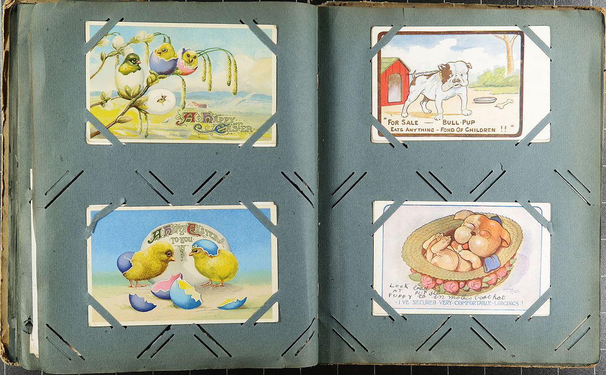 Family Postcard Collection Part A. An old-time collection of 187 postcards, in an equally old-time paper Postcard Album. While time has not been kind to the album, the postcards in have mostly held in-place, with several "loose" from when fallen out at sometime. While fairly "British" in origin, there are interesting cards mixed throughout including WWI Patriotic, "Captured German UC5 Mine Laying Submarine", Real Photo Postcards, 1915 Belgian Relief Fund, Dog/Cat illustrated (including Louis Wain), Greetings, Foreign etc. Offered as received, as one of four lots, all in this sale from the same family. Estimate =