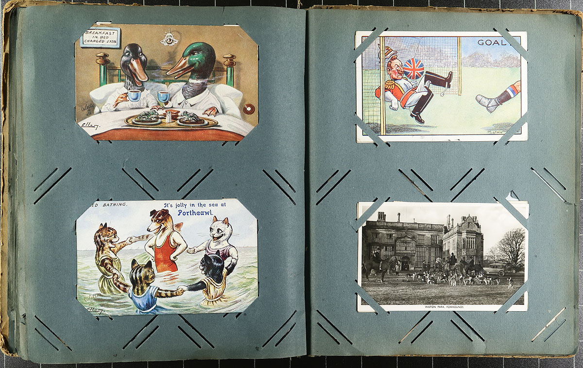 Family Postcard Collection Part A. An old-time collection of 187 postcards, in an equally old-time paper Postcard Album. While time has not been kind to the album, the postcards in have mostly held in-place, with several "loose" from when fallen out at sometime. While fairly "British" in origin, there are interesting cards mixed throughout including WWI Patriotic, "Captured German UC5 Mine Laying Submarine", Real Photo Postcards, 1915 Belgian Relief Fund, Dog/Cat illustrated (including Louis Wain), Greetings, Foreign etc. Offered as received, as one of four lots, all in this sale from the same family. Estimate =