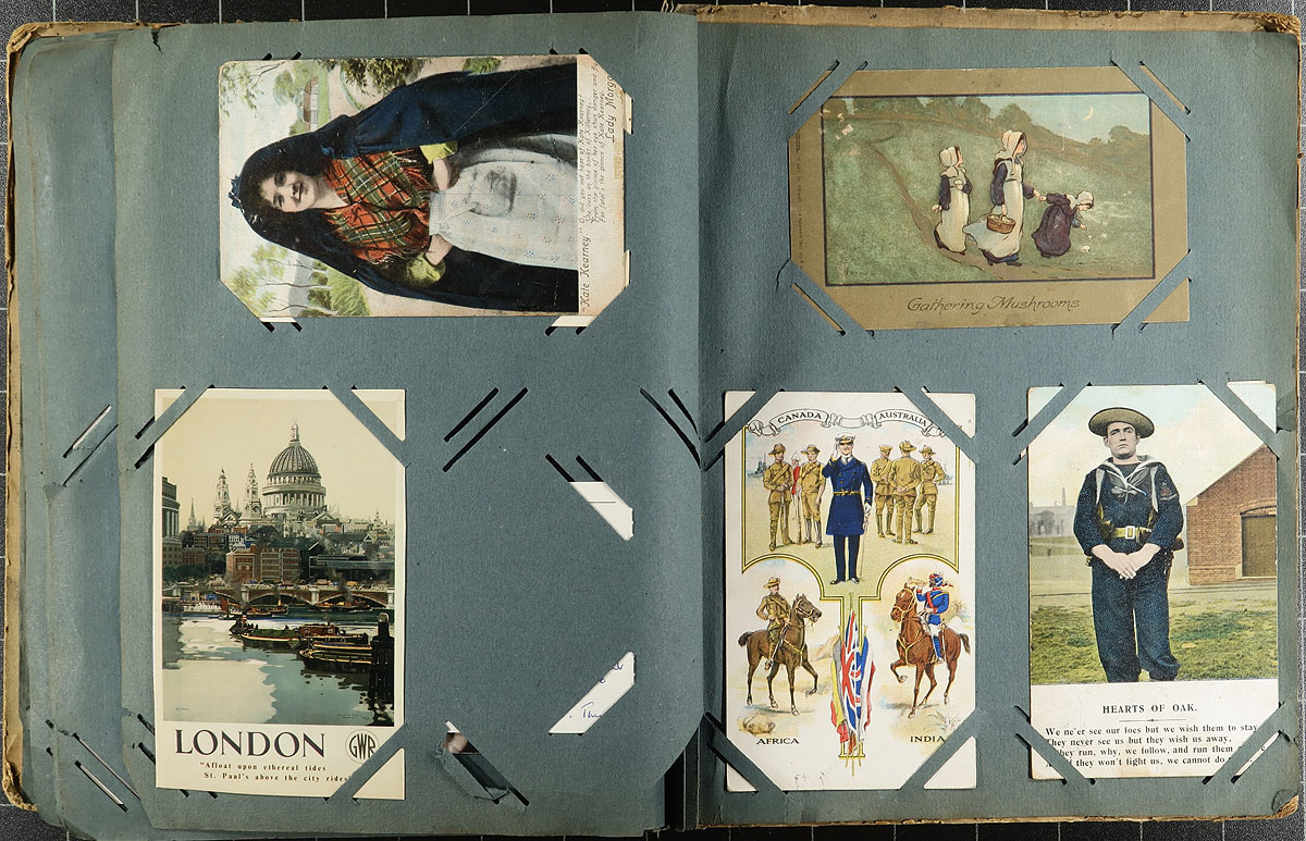 Family Postcard Collection Part A. An old-time collection of 187 postcards, in an equally old-time paper Postcard Album. While time has not been kind to the album, the postcards in have mostly held in-place, with several "loose" from when fallen out at sometime. While fairly "British" in origin, there are interesting cards mixed throughout including WWI Patriotic, "Captured German UC5 Mine Laying Submarine", Real Photo Postcards, 1915 Belgian Relief Fund, Dog/Cat illustrated (including Louis Wain), Greetings, Foreign etc. Offered as received, as one of four lots, all in this sale from the same family. Estimate =