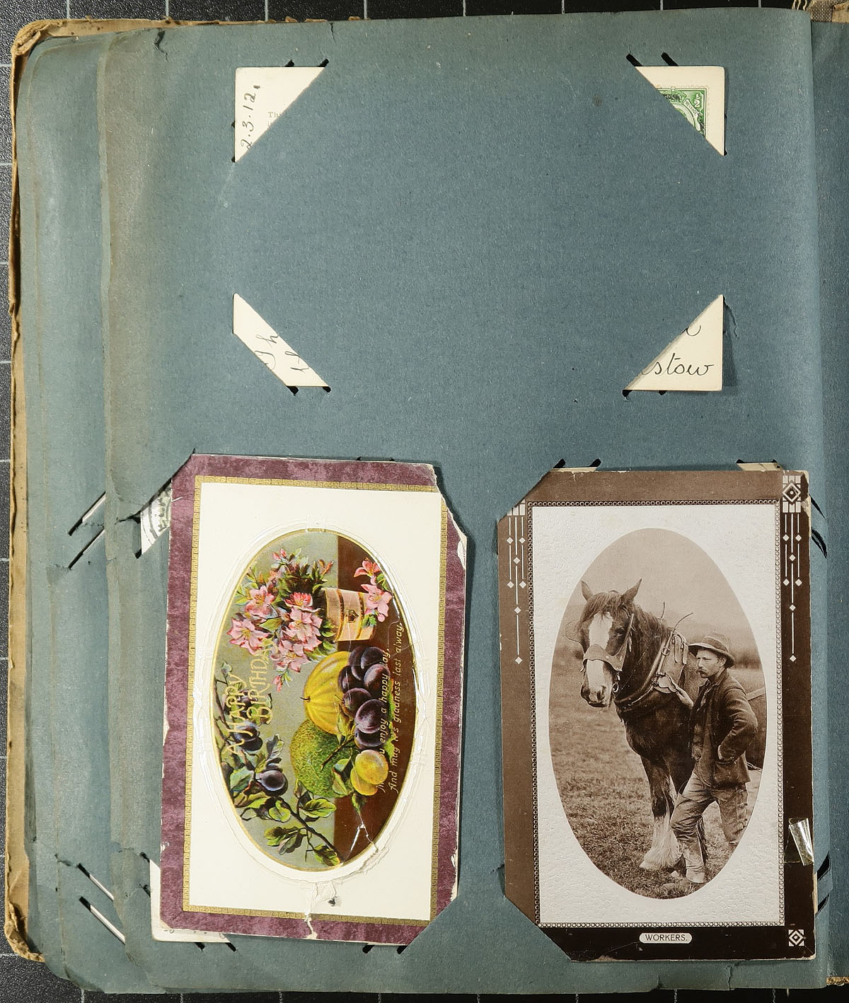 Family Postcard Collection Part A. An old-time collection of 187 postcards, in an equally old-time paper Postcard Album. While time has not been kind to the album, the postcards in have mostly held in-place, with several "loose" from when fallen out at sometime. While fairly "British" in origin, there are interesting cards mixed throughout including WWI Patriotic, "Captured German UC5 Mine Laying Submarine", Real Photo Postcards, 1915 Belgian Relief Fund, Dog/Cat illustrated (including Louis Wain), Greetings, Foreign etc. Offered as received, as one of four lots, all in this sale from the same family. Estimate =