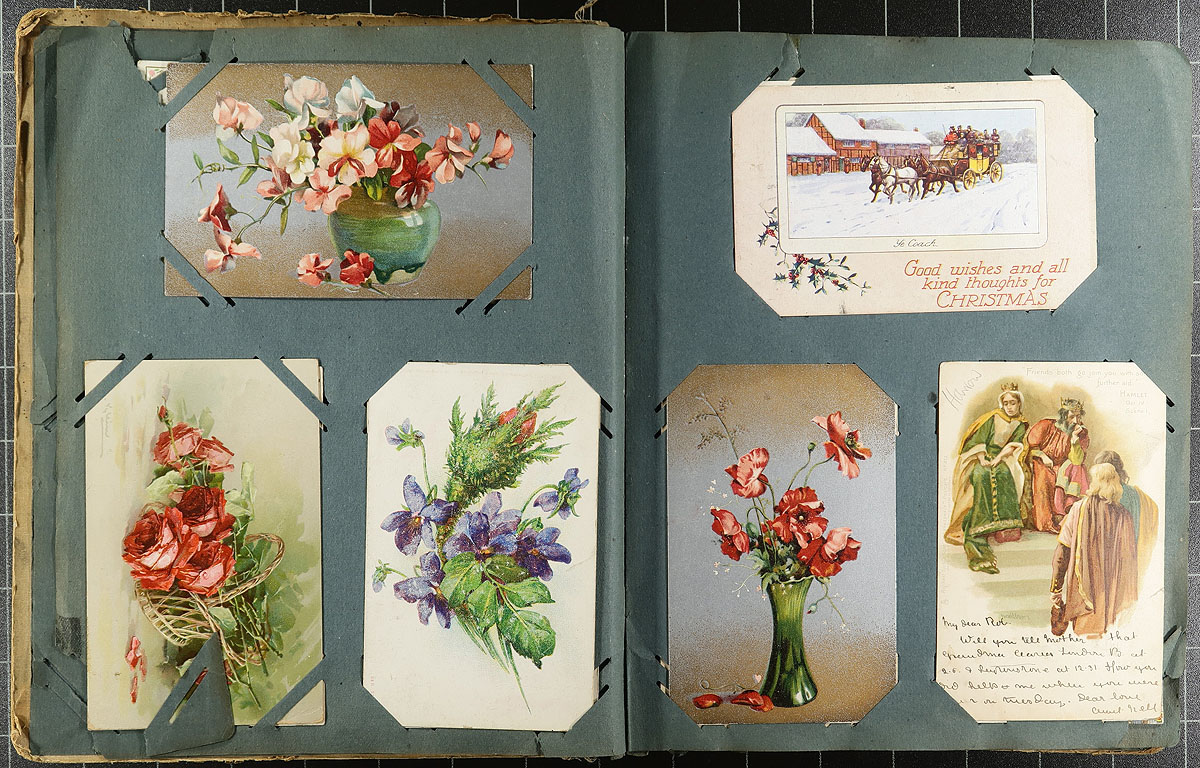 Family Postcard Collection Part A. An old-time collection of 187 postcards, in an equally old-time paper Postcard Album. While time has not been kind to the album, the postcards in have mostly held in-place, with several "loose" from when fallen out at sometime. While fairly "British" in origin, there are interesting cards mixed throughout including WWI Patriotic, "Captured German UC5 Mine Laying Submarine", Real Photo Postcards, 1915 Belgian Relief Fund, Dog/Cat illustrated (including Louis Wain), Greetings, Foreign etc. Offered as received, as one of four lots, all in this sale from the same family. Estimate =