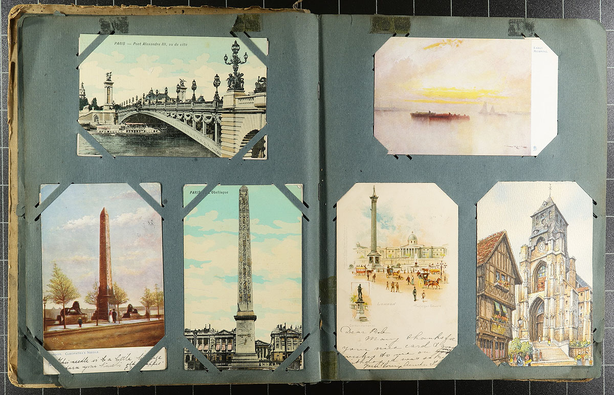 Family Postcard Collection Part A. An old-time collection of 187 postcards, in an equally old-time paper Postcard Album. While time has not been kind to the album, the postcards in have mostly held in-place, with several "loose" from when fallen out at sometime. While fairly "British" in origin, there are interesting cards mixed throughout including WWI Patriotic, "Captured German UC5 Mine Laying Submarine", Real Photo Postcards, 1915 Belgian Relief Fund, Dog/Cat illustrated (including Louis Wain), Greetings, Foreign etc. Offered as received, as one of four lots, all in this sale from the same family. Estimate =