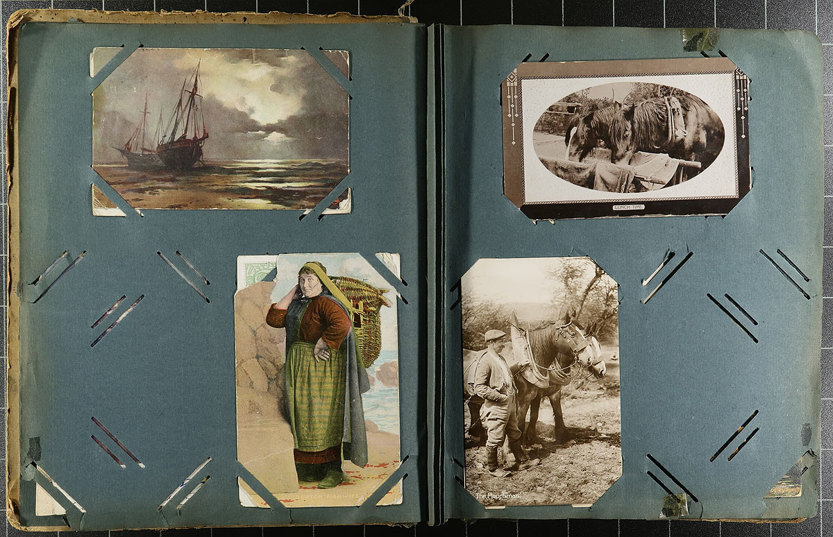 Family Postcard Collection Part A. An old-time collection of 187 postcards, in an equally old-time paper Postcard Album. While time has not been kind to the album, the postcards in have mostly held in-place, with several "loose" from when fallen out at sometime. While fairly "British" in origin, there are interesting cards mixed throughout including WWI Patriotic, "Captured German UC5 Mine Laying Submarine", Real Photo Postcards, 1915 Belgian Relief Fund, Dog/Cat illustrated (including Louis Wain), Greetings, Foreign etc. Offered as received, as one of four lots, all in this sale from the same family. Estimate =