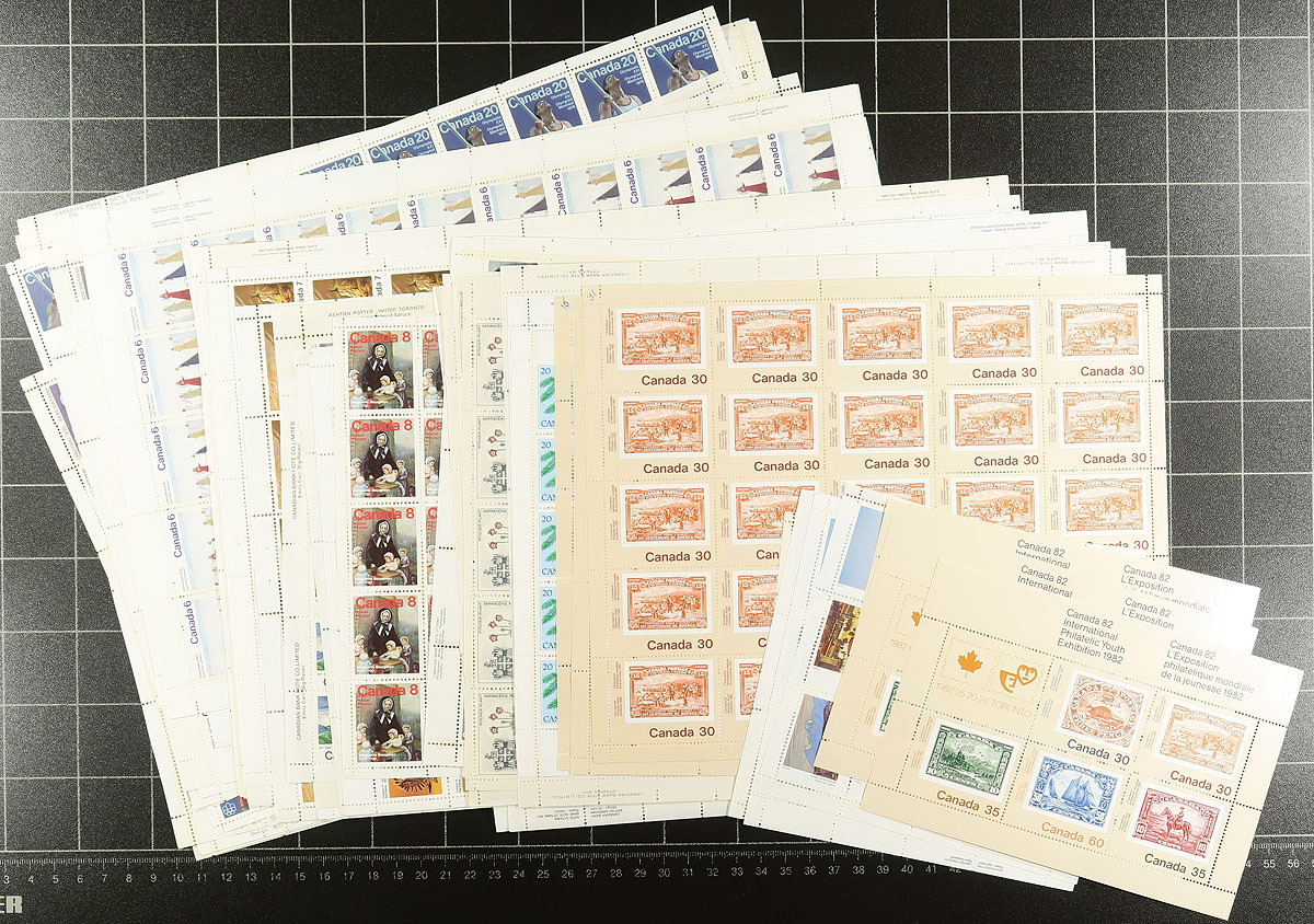 Mint Sheet Potpourri. A clean assortment of mostly 1960's-1980's complete sheets, miniature panes, including some of the tougher larger format sheets of 100 stamps. All neatly confined within a sheet file folder. Conservatively valued for the total face / postage value only. Total face value =