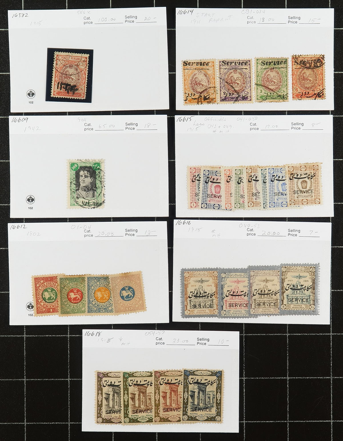 An interesting and potential laden offering of 39x "102" cards, each with early Iranian / Persian issues. While many of these stamps are assessed substantial catalogue value, plenty of forgeries are known to exist, so use a critical eye on the images. A wonderful opportunity to engulf yourself in learning about / identifying these early issues. These are priced by the previous owner at $611.00 (and note, that is show/retail price, only a fraction of the given catalogue value). Estimate =