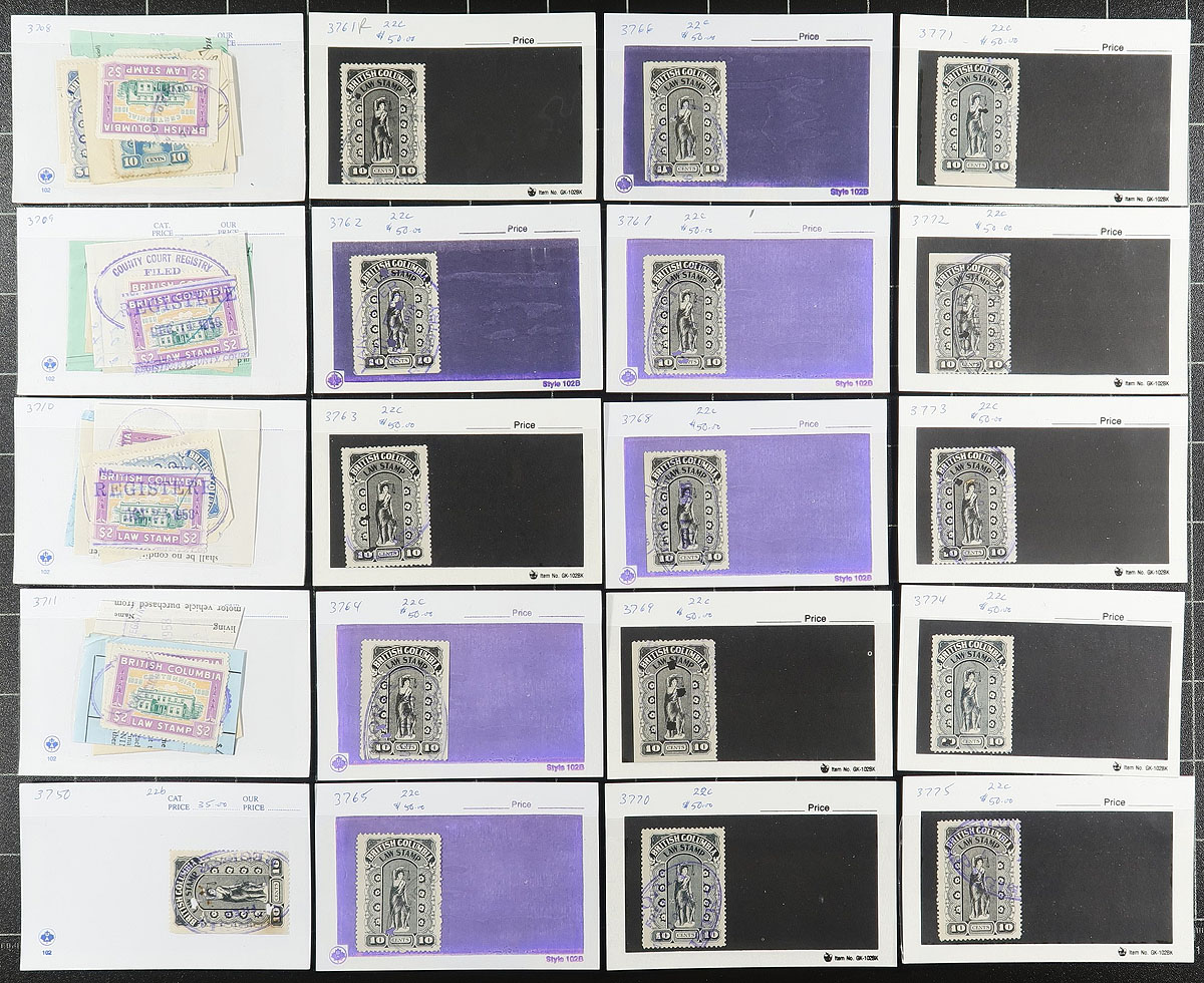 British Columbia Law Stamps. A valuable used hoard of BC law stamps, assembled in "102" cards, with van Dam catalogue values up to $50.00 for individual stamps! Roughly 200+ stamps on 110 cards, with cancel interest throughout. A great opportunity of someone looking to search of varieties / cancellations on these issues. Estimate =