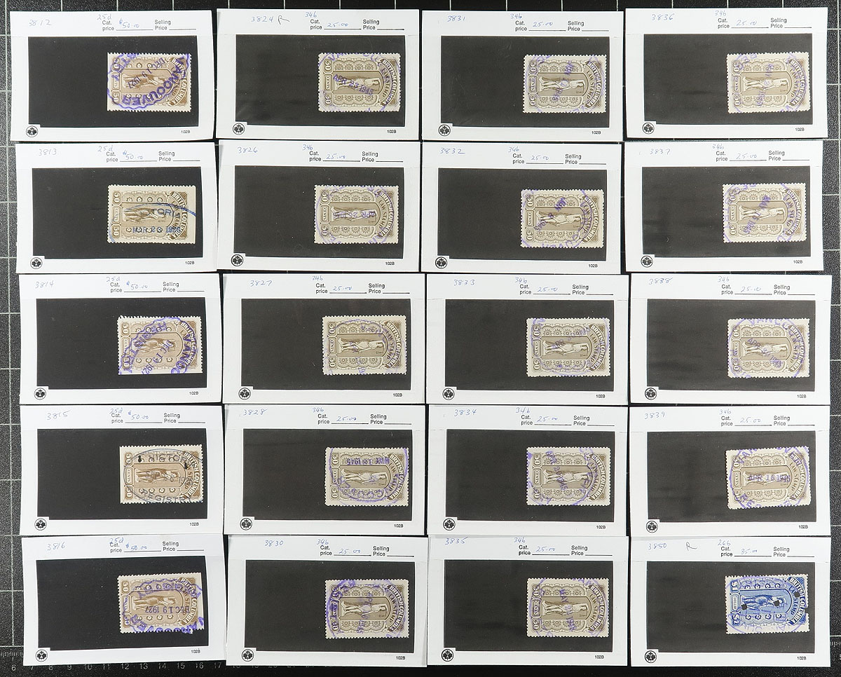 British Columbia Law Stamps. A valuable used hoard of BC law stamps, assembled in "102" cards, with van Dam catalogue values up to $50.00 for individual stamps! Roughly 200+ stamps on 110 cards, with cancel interest throughout. A great opportunity of someone looking to search of varieties / cancellations on these issues. Estimate =