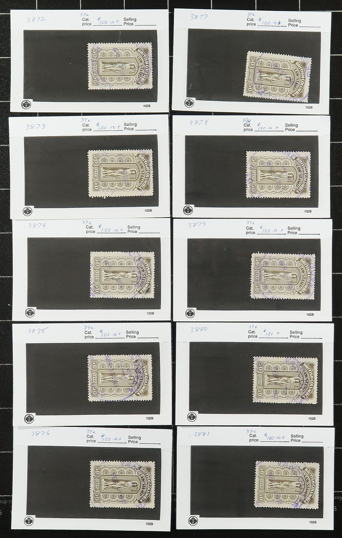 British Columbia Law Stamps. A valuable used hoard of BC law stamps, assembled in "102" cards, with van Dam catalogue values up to $50.00 for individual stamps! Roughly 200+ stamps on 110 cards, with cancel interest throughout. A great opportunity of someone looking to search of varieties / cancellations on these issues. Estimate =