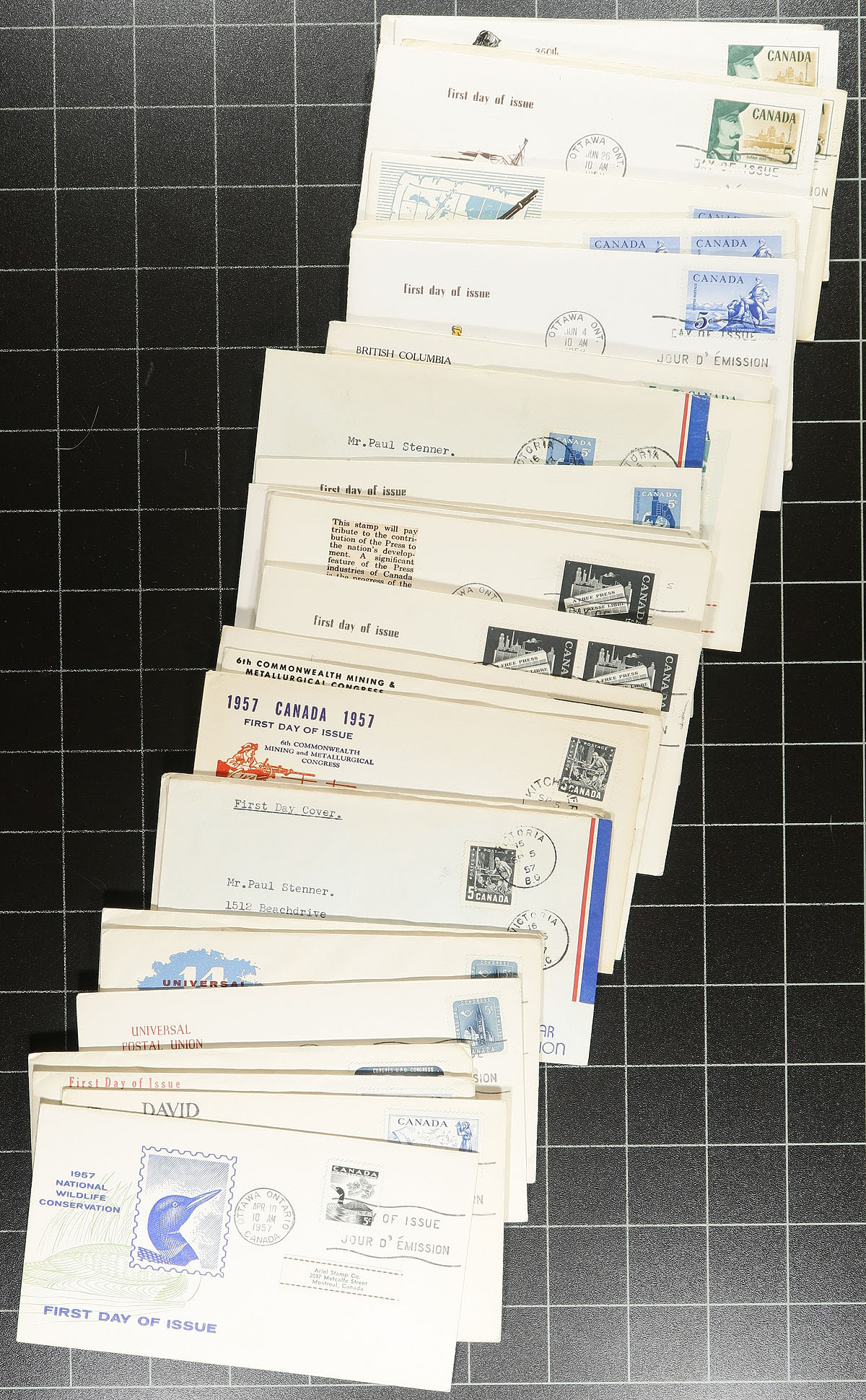 First Day Covers Holding. A collector's assembly of 1930's to 1970's FDC, with over 200 in total arranged within a small box. Several better earlier noted, including a complete set of 1932 George V Medallion, 1942 George V 50c War Issue, 1934 New Brunswick and 1934 Empire Loyalists (to name a few). Most of the post-1950 FDC are private cachets, with several lesser seen cachet makers noted. Well worth our reasonable estimate of less than $1.00 per item. Estimate =
