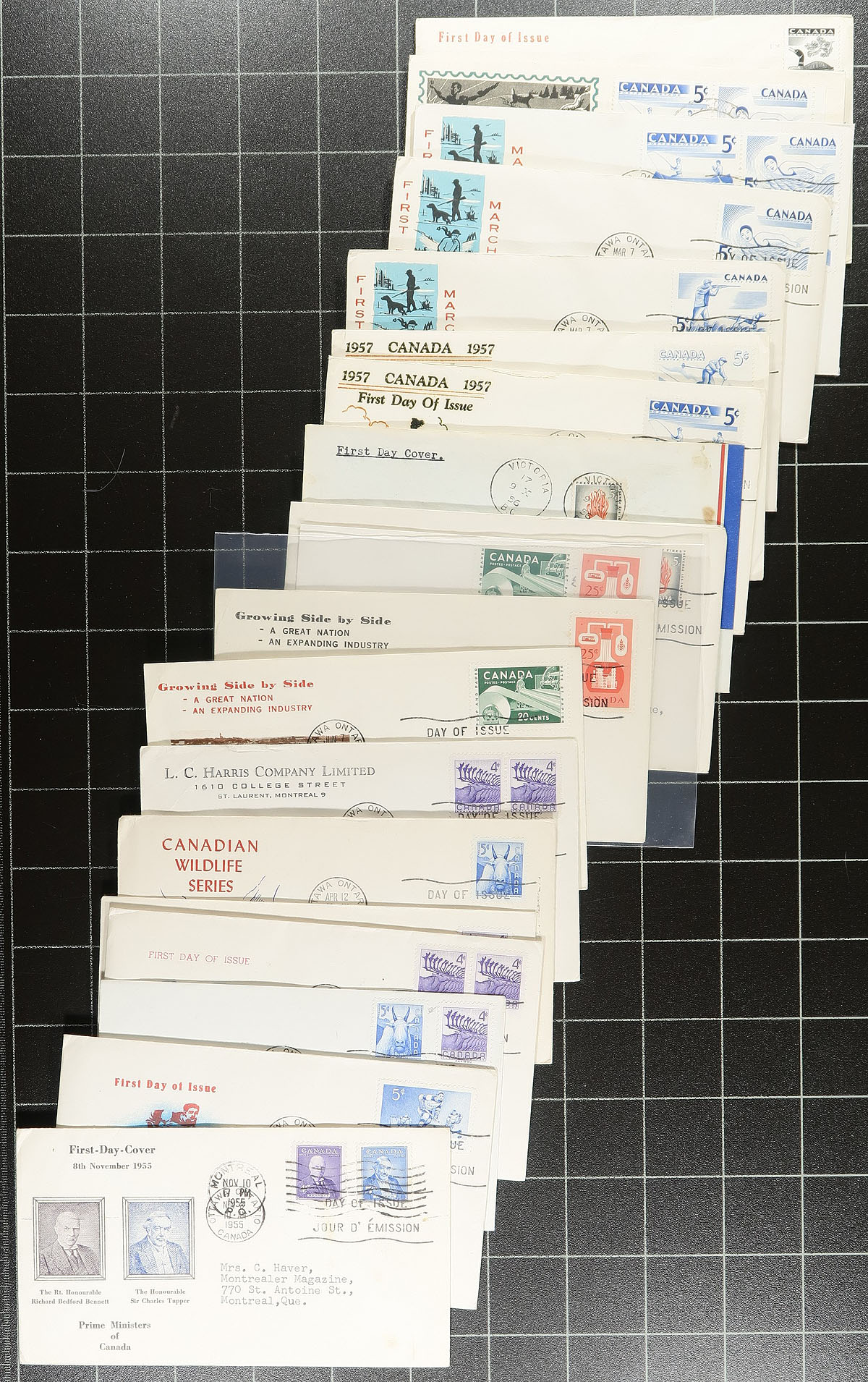 First Day Covers Holding. A collector's assembly of 1930's to 1970's FDC, with over 200 in total arranged within a small box. Several better earlier noted, including a complete set of 1932 George V Medallion, 1942 George V 50c War Issue, 1934 New Brunswick and 1934 Empire Loyalists (to name a few). Most of the post-1950 FDC are private cachets, with several lesser seen cachet makers noted. Well worth our reasonable estimate of less than $1.00 per item. Estimate =