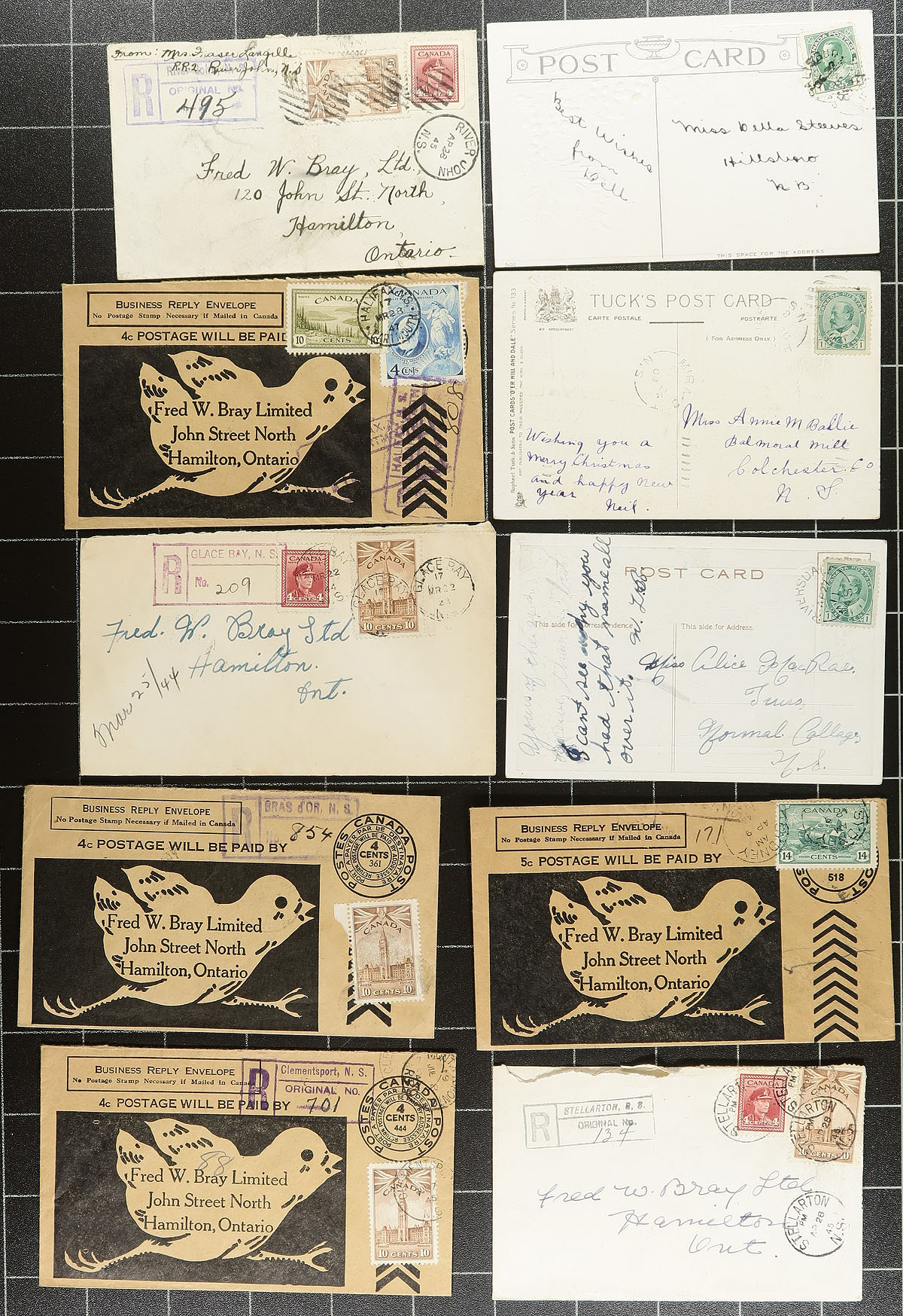 Nova Scotia Postmarks. A high-quality offering of 61 town postmarks from the Edward VII to George VI period, on postcard or cover. Noted many better items, such as registered covers, rates, censor etc. Quality of strikes seems to be well above average, assembled by a collector with an eye for postmarks. A great lot for the postmark hound! Estimate =