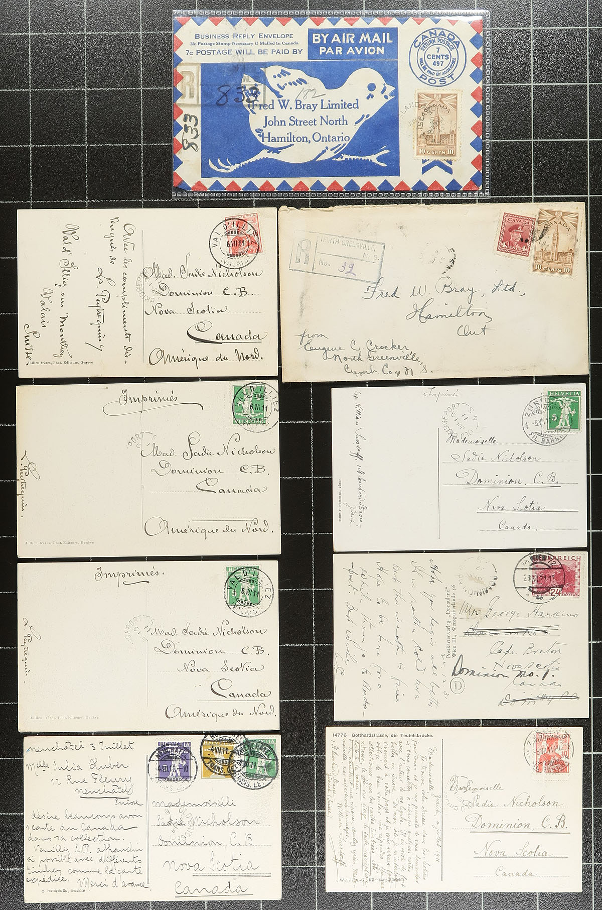 Nova Scotia Postmarks. A high-quality offering of 61 town postmarks from the Edward VII to George VI period, on postcard or cover. Noted many better items, such as registered covers, rates, censor etc. Quality of strikes seems to be well above average, assembled by a collector with an eye for postmarks. A great lot for the postmark hound! Estimate =