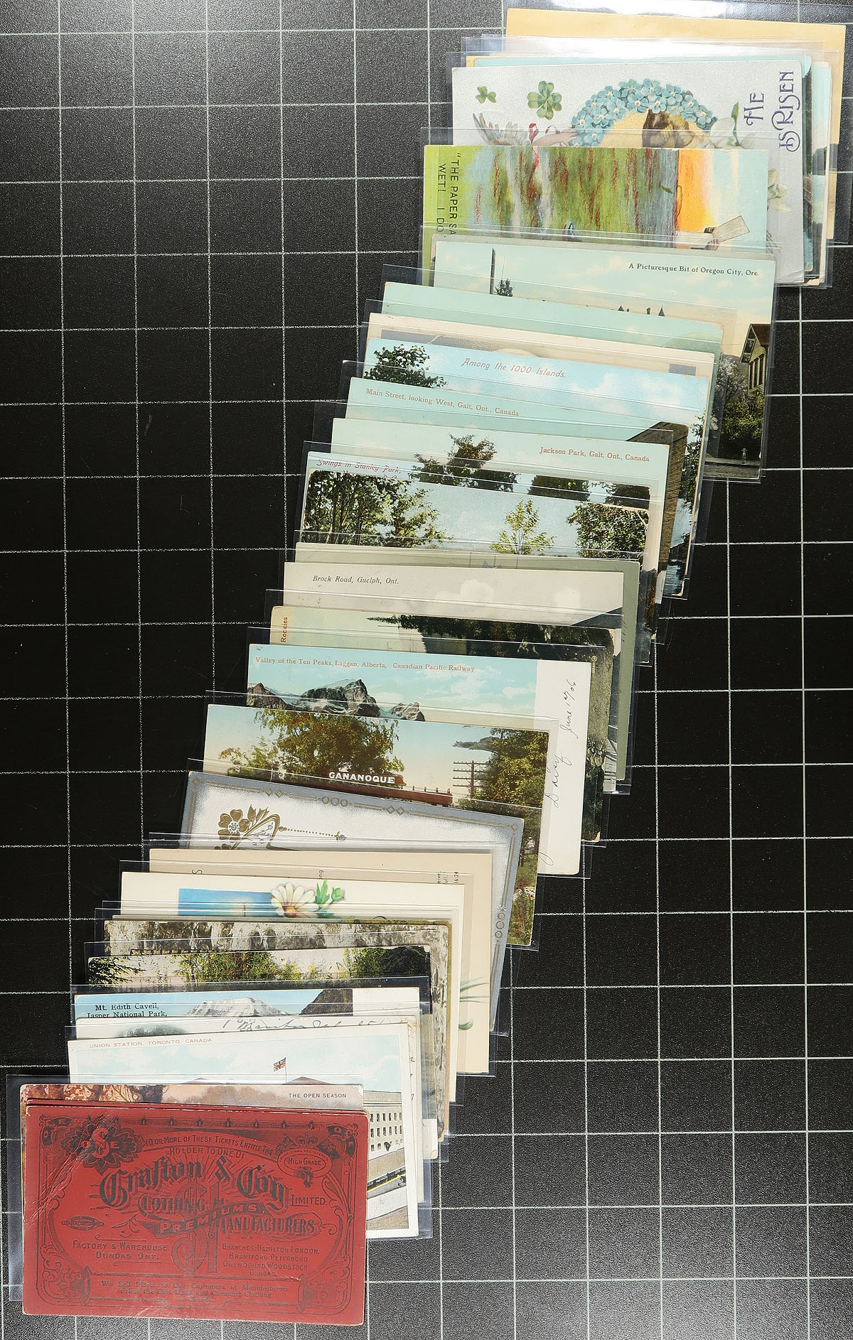 Dealer's Estate Postcard Box. A cardboard "show-box" filled with about 400 postcards, primarily Canada / USA / UK, with a touch of misc Worldwide / Greetings etc. Far better than your usual holding, with almost all being individually sleeved and many priced lightly on the back in pencil (noted many priced at $20+). Take a good look at the sample pictures to get an idea of the quality/contents are. Well worth the reasonable estimate at less than 50c per item. Estimate =