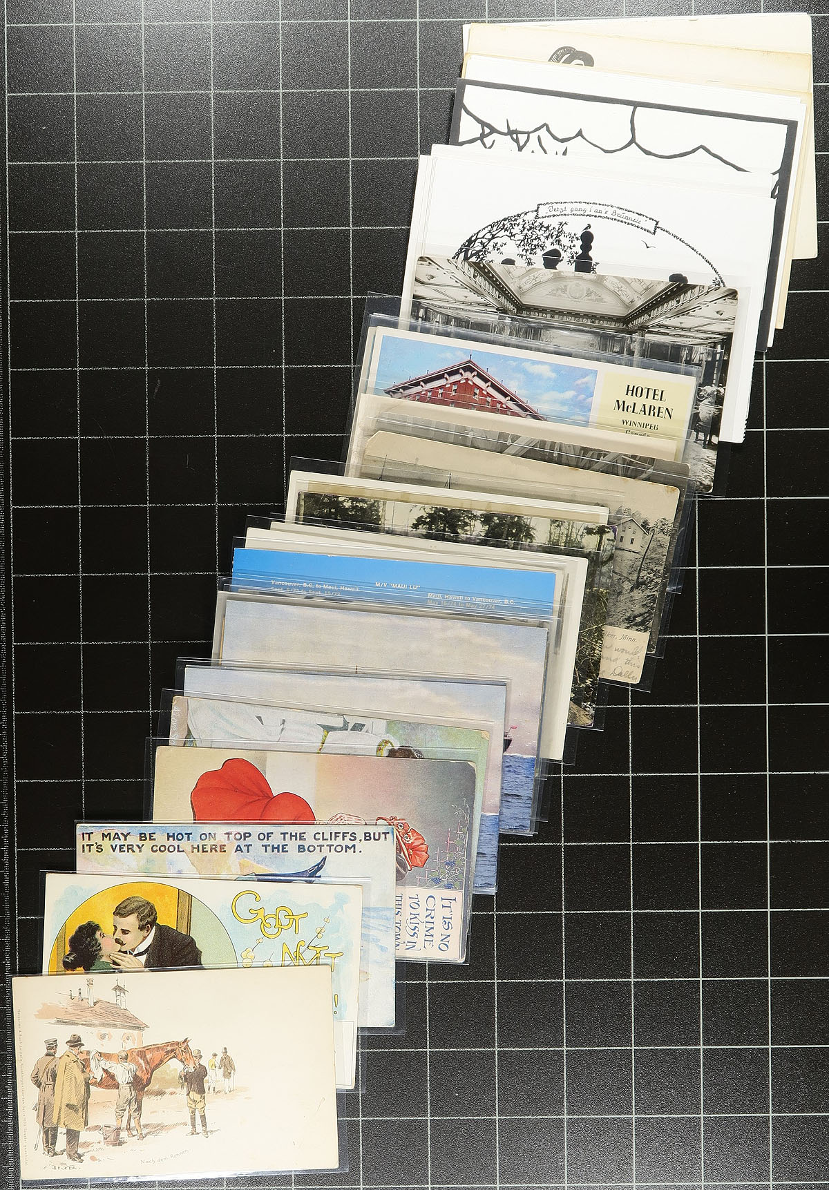 Dealer's Estate Postcard Box. A cardboard "show-box" filled with about 400 postcards, primarily Canada / USA / UK, with a touch of misc Worldwide / Greetings etc. Far better than your usual holding, with almost all being individually sleeved and many priced lightly on the back in pencil (noted many priced at $20+). Take a good look at the sample pictures to get an idea of the quality/contents are. Well worth the reasonable estimate at less than 50c per item. Estimate =